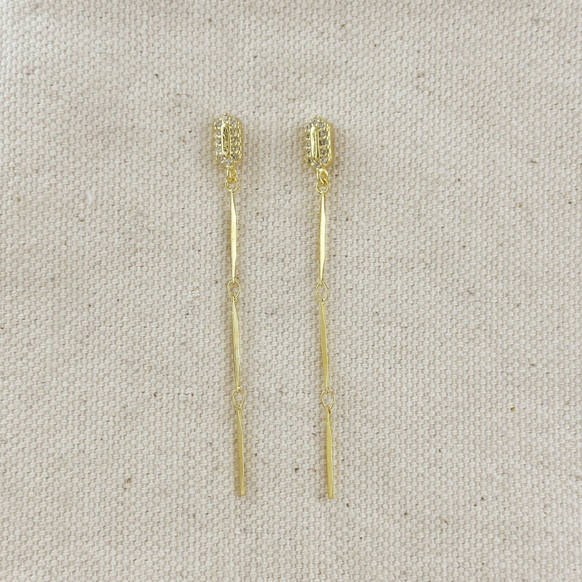 Elevate your look with these sleek 18K gold filled straw drop earrings. Measuring 2.5 inches long, these elegant earrings feature a sparkling CZ-adorned huggie top that connects to a gracefully elongated bar drop for effortless sophistication.