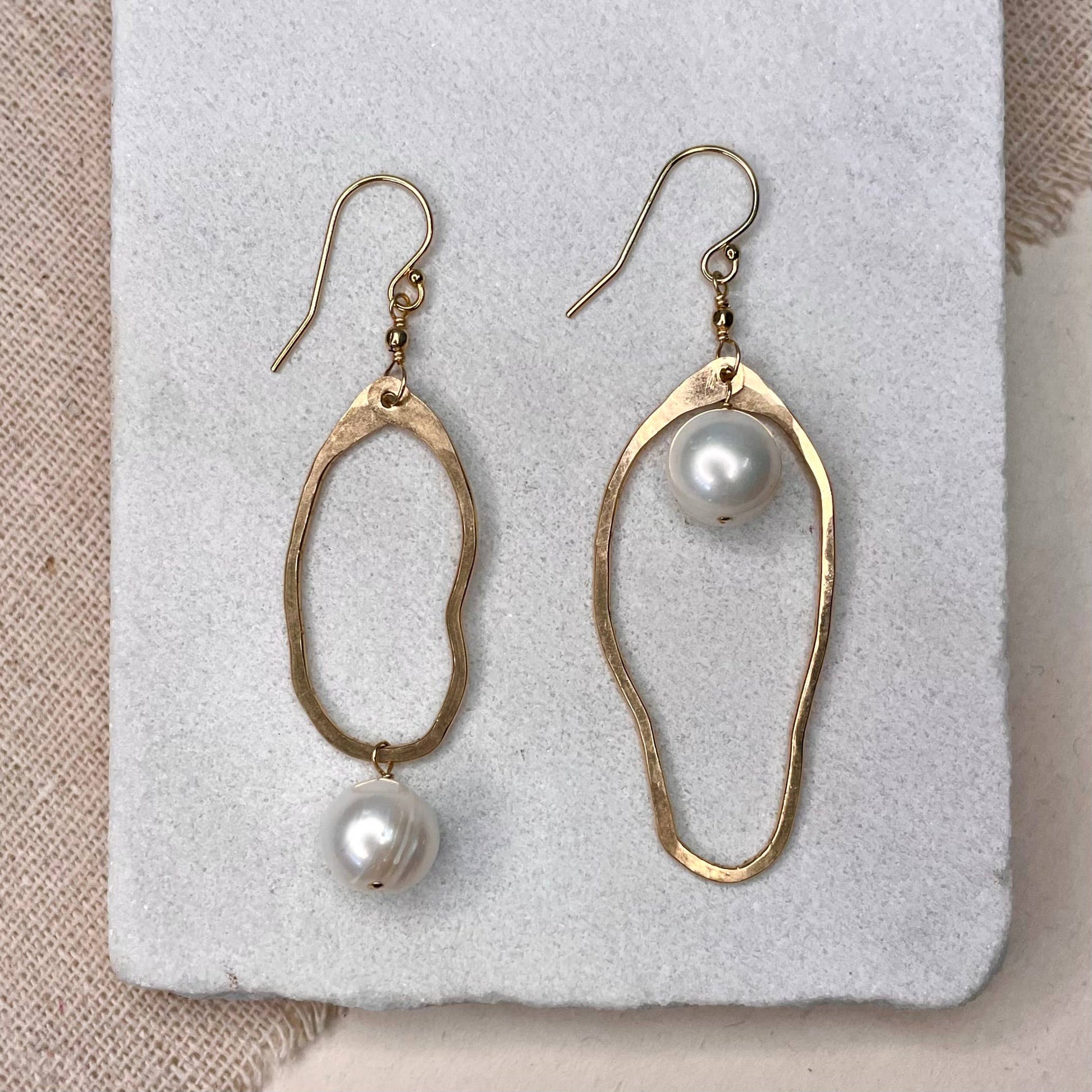 Two natural and asymmetrical hand hammered shapes, adorned with natural freshwater pearls. - Approx. 2.5" - Waterproof and sweat-proof. - Hypoallergenic, lead and nickel free. - Handmade in Portland, Oregon.