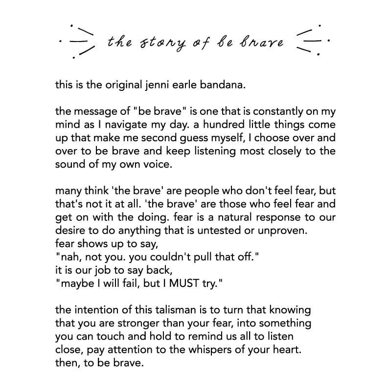 Made in the Southern USA with the mantra “be brave” on one corner. SO many uses for a great quality bandana with summer coming up! from hiking, doggy beautification, camping and yoga to beach accessories, gardening, and just some gorgeous, on trend, western style! just pop it around your neck or tie on your tote bags. these bandanas also make excellent graduation gifts as each one comes with it's own hit of encouragement and inspiration. We make these bandanas to be used as talismans to help us remember everyday that we are so much stronger and more capable than we know.