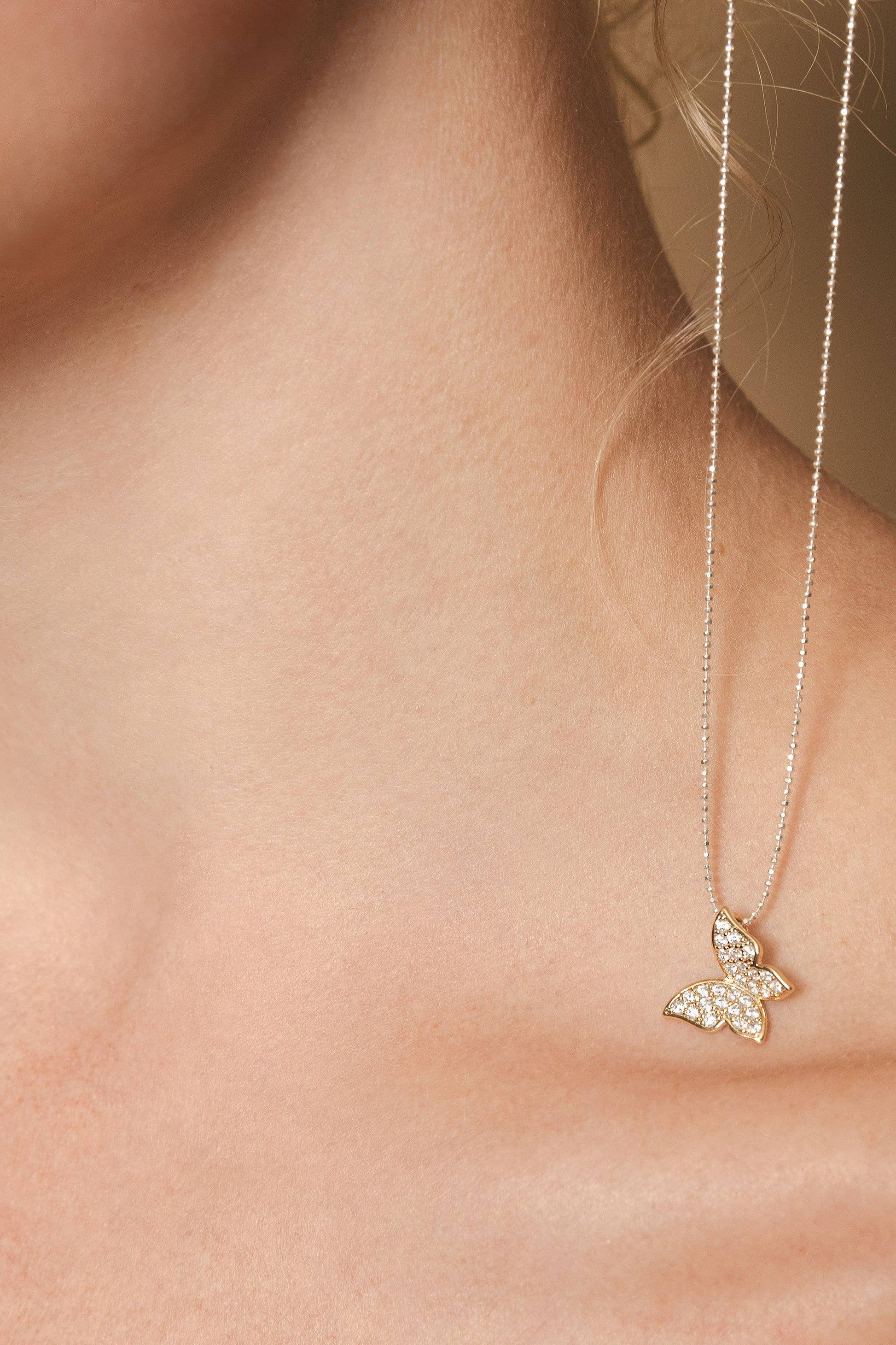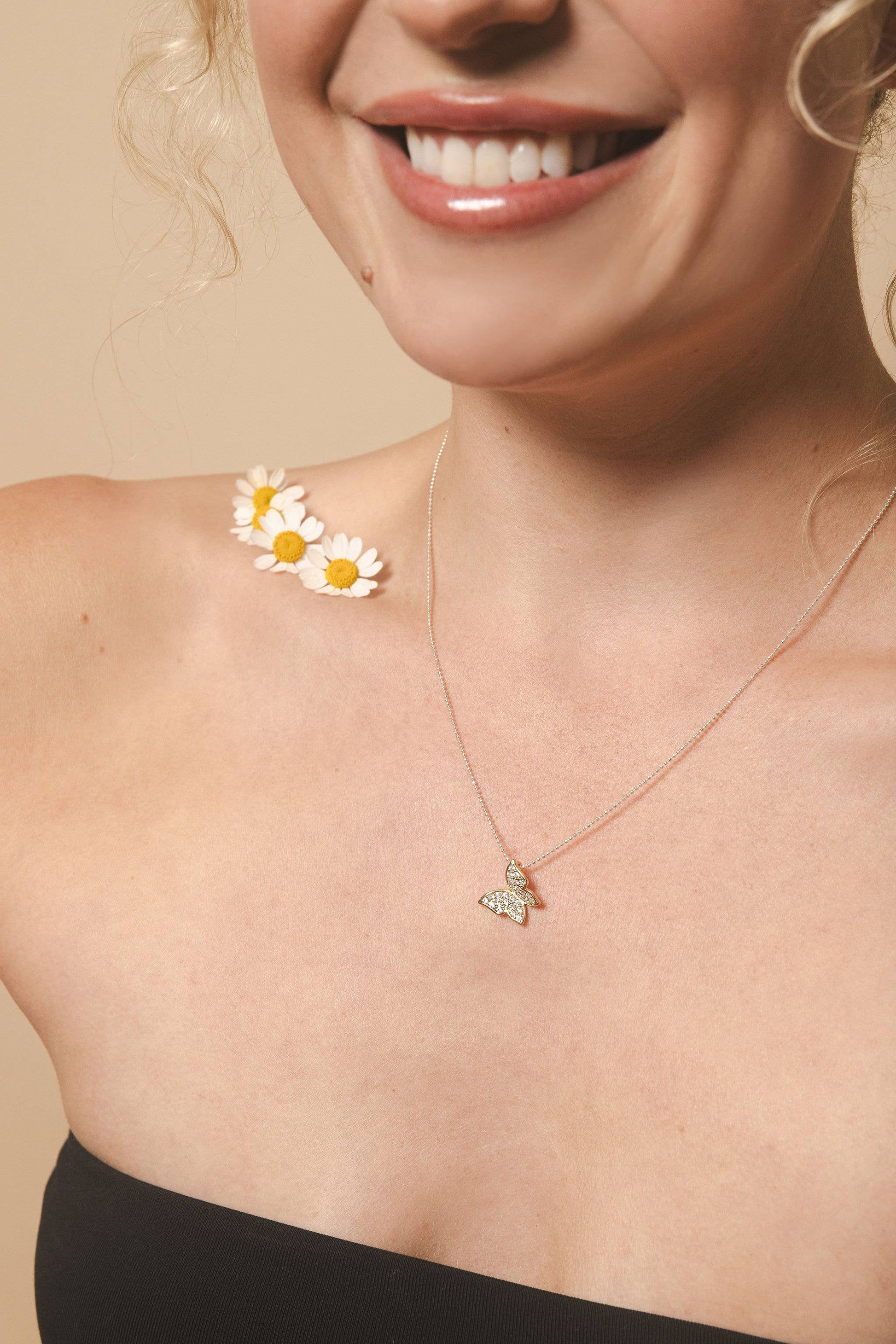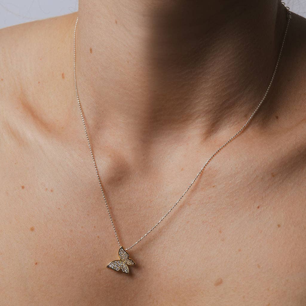 The Betty necklace is perfect for those who appreciate modern, artistic interpretations of natural motifs. The butterfly appears to hover on the chain, ready to take off. Her wings are made up of a pavé setting, which entails tiny cubic stones set closely together, creating a shimmering effect.