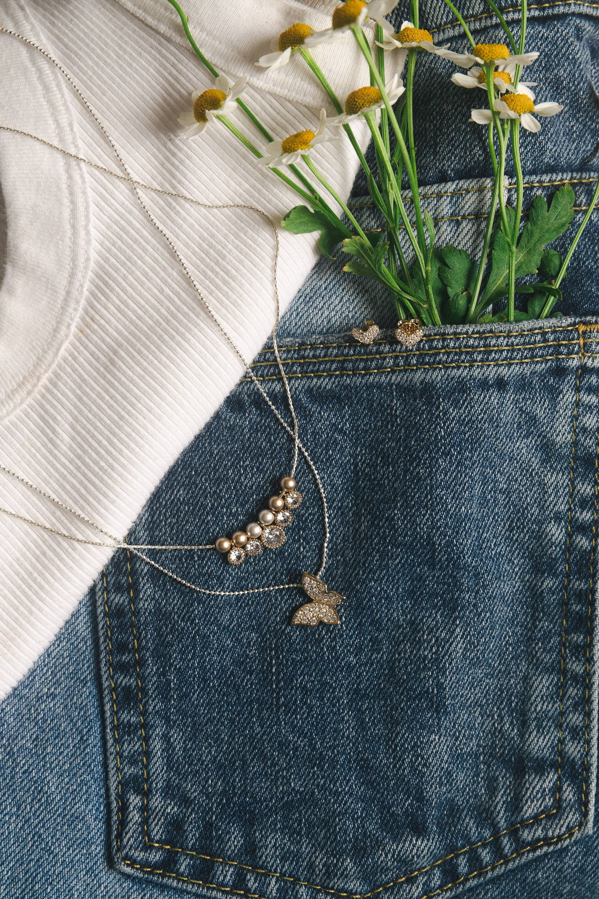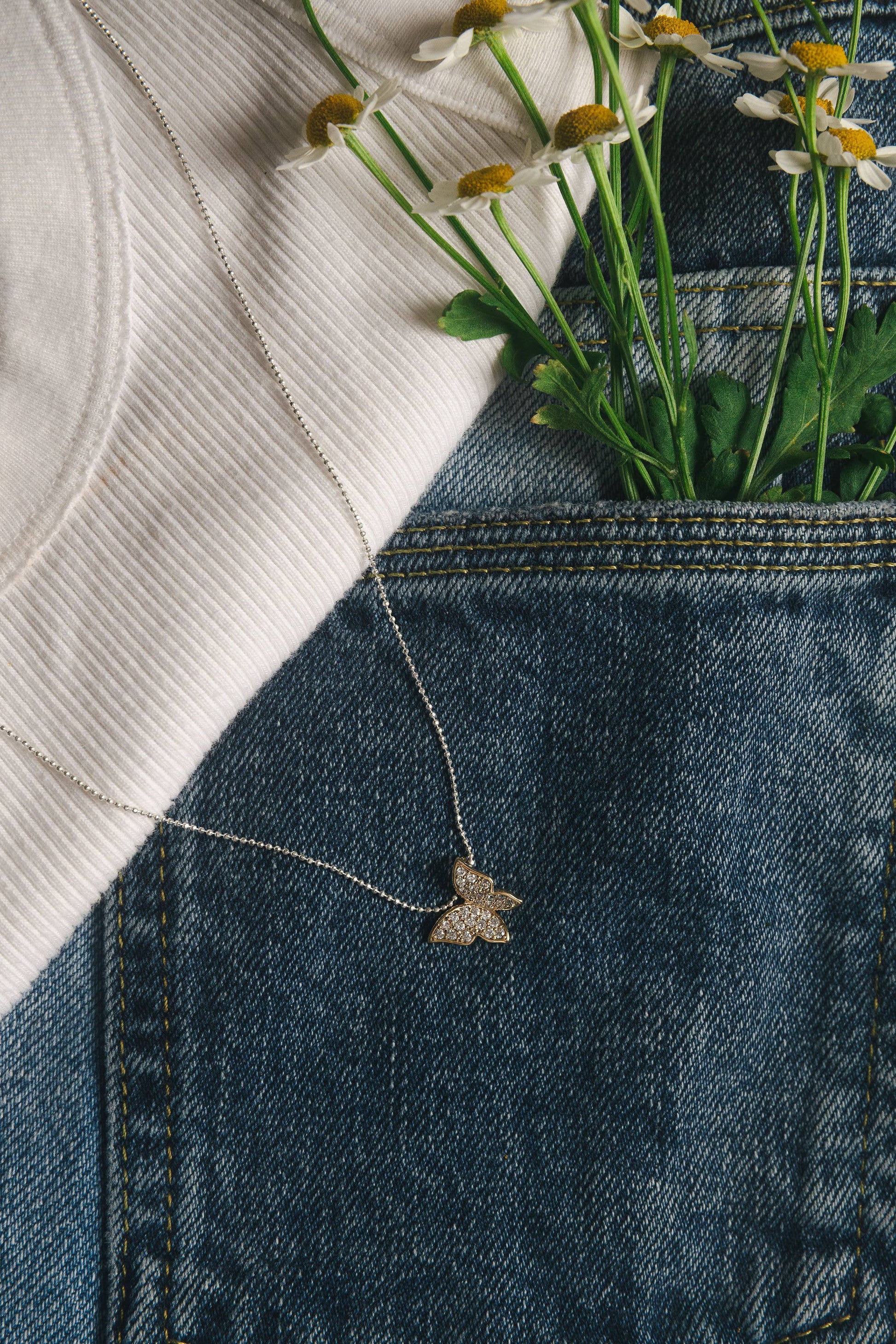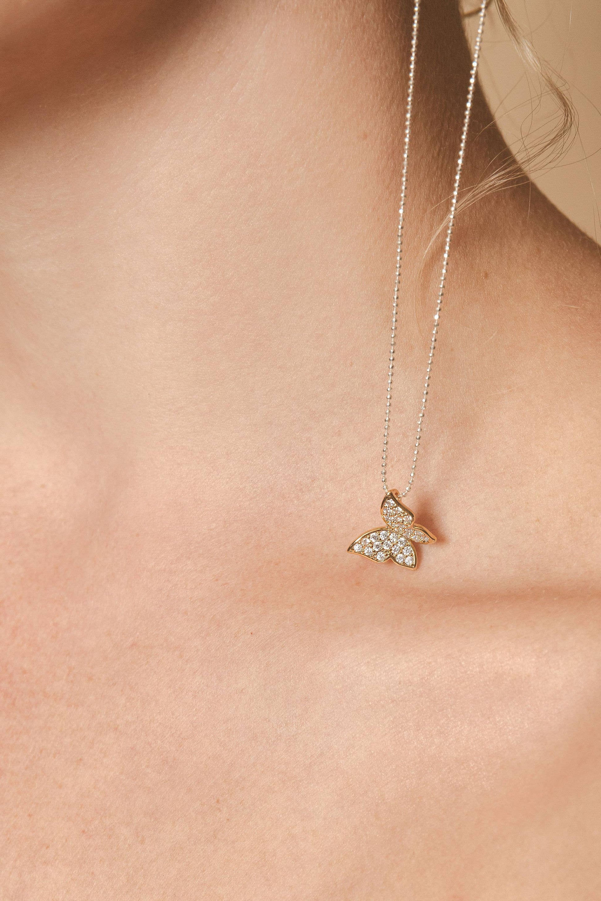 The Betty necklace is perfect for those who appreciate modern, artistic interpretations of natural motifs. The butterfly appears to hover on the chain, ready to take off. Her wings are made up of a pavé setting, which entails tiny cubic stones set closely together, creating a shimmering effect.