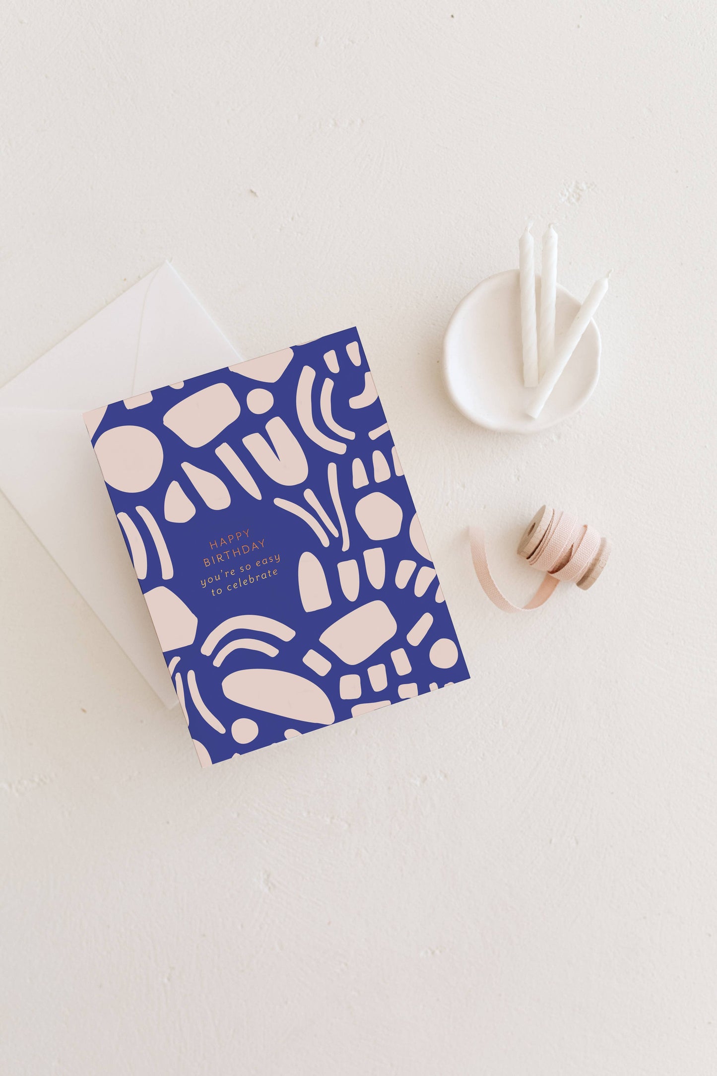 A vibrant blue with a copper foil message to celebrate the person who is easy to celebrate.