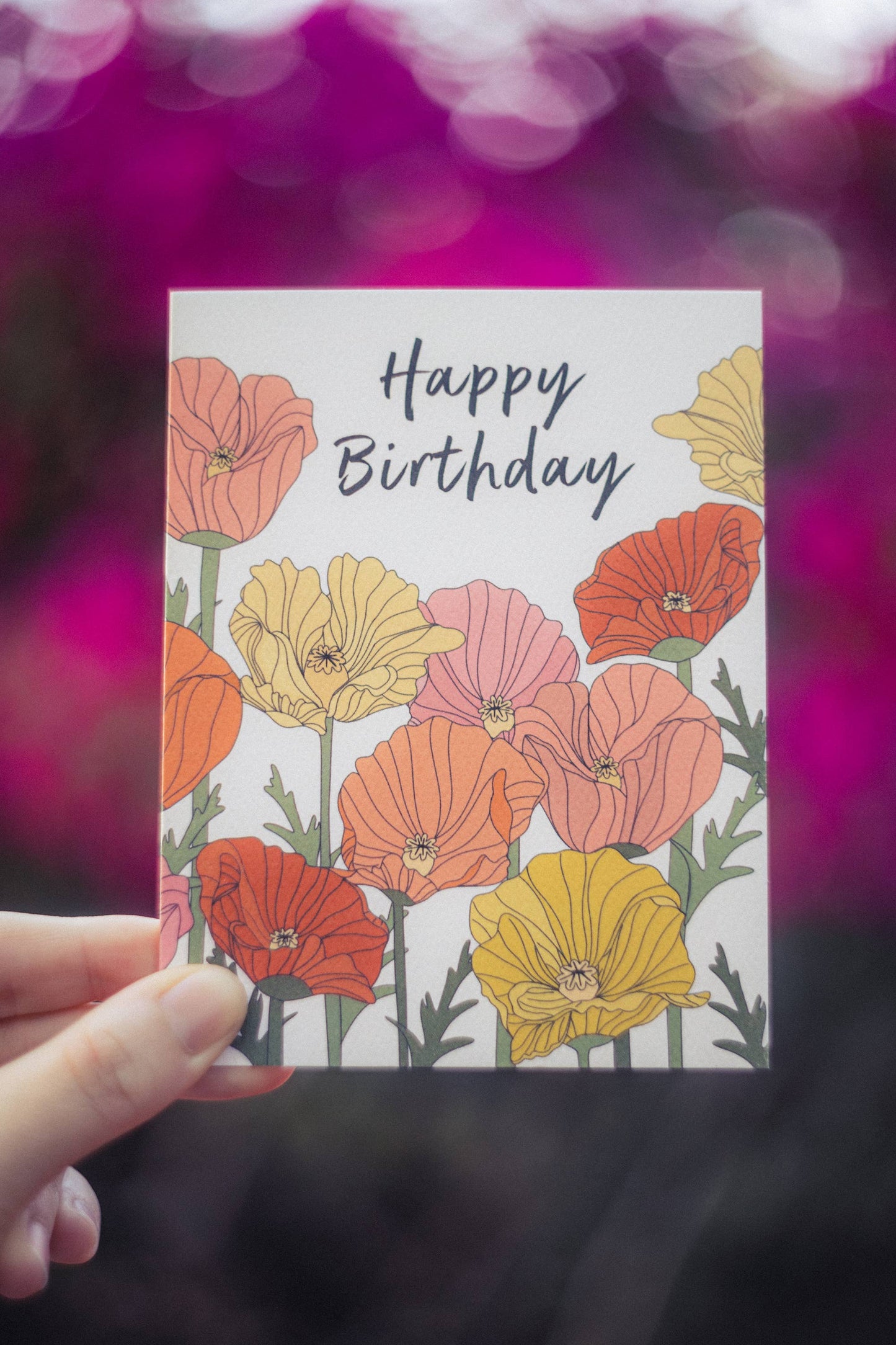 Blooming with birthday wishes! Our vibrant poppy themed greeting card is here to spread joy on your special day. Let the flowers whisper sweet words of celebration and the colors brighten your world. Happy Birthday!