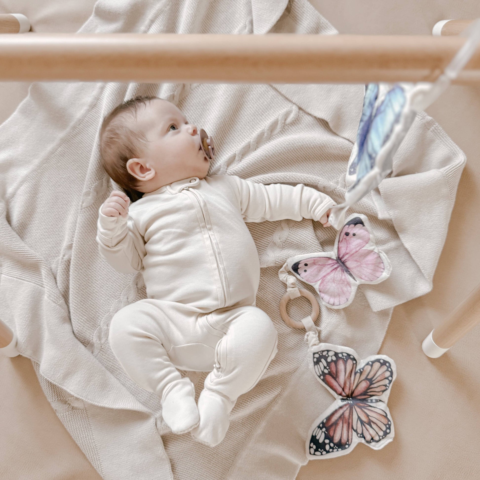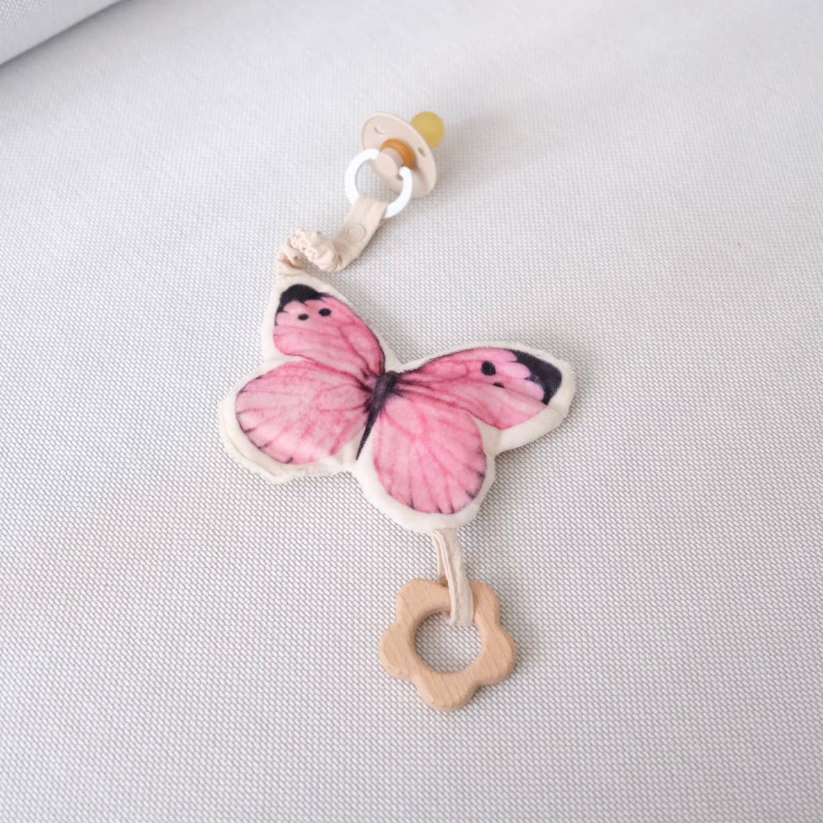 Each is detachable if you just want to bring one or two out, or if you want to attach them separately on the baby gym. The small pink butterfly can also be used alone as a pacifier holder.