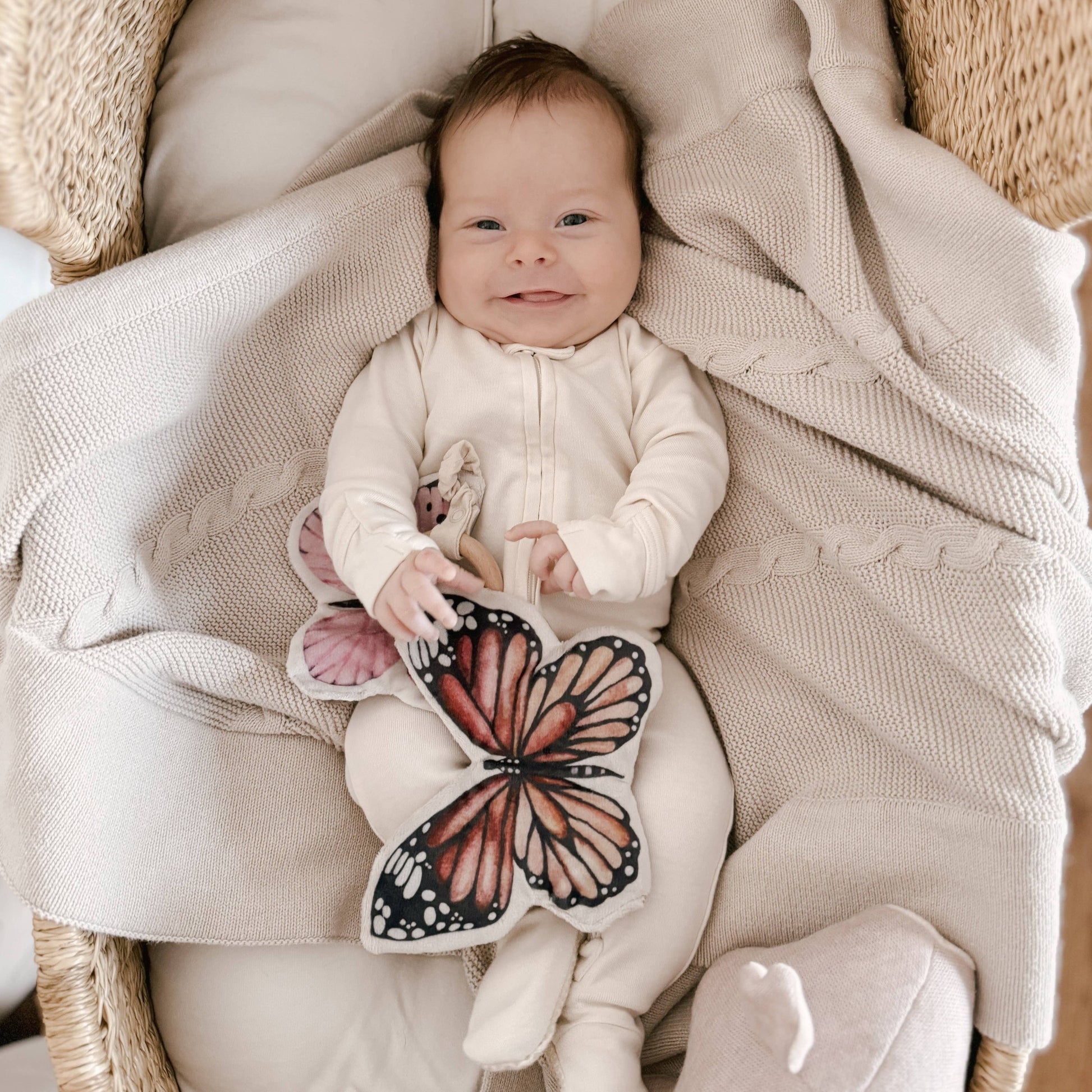 Designed to grab your baby's attention, these butterflies will definitely attract those eyes with their colorful and high contrast bodies. The backs of each butterfly is made with a reflective fabric in different pastel colors too! The blue and pink butterfly rattles while the orange butterfly squeaks. Safe to mouth as always, these crinkly butterflies also encourages your baby to grasp and as they make sounds, your baby will just want them more!