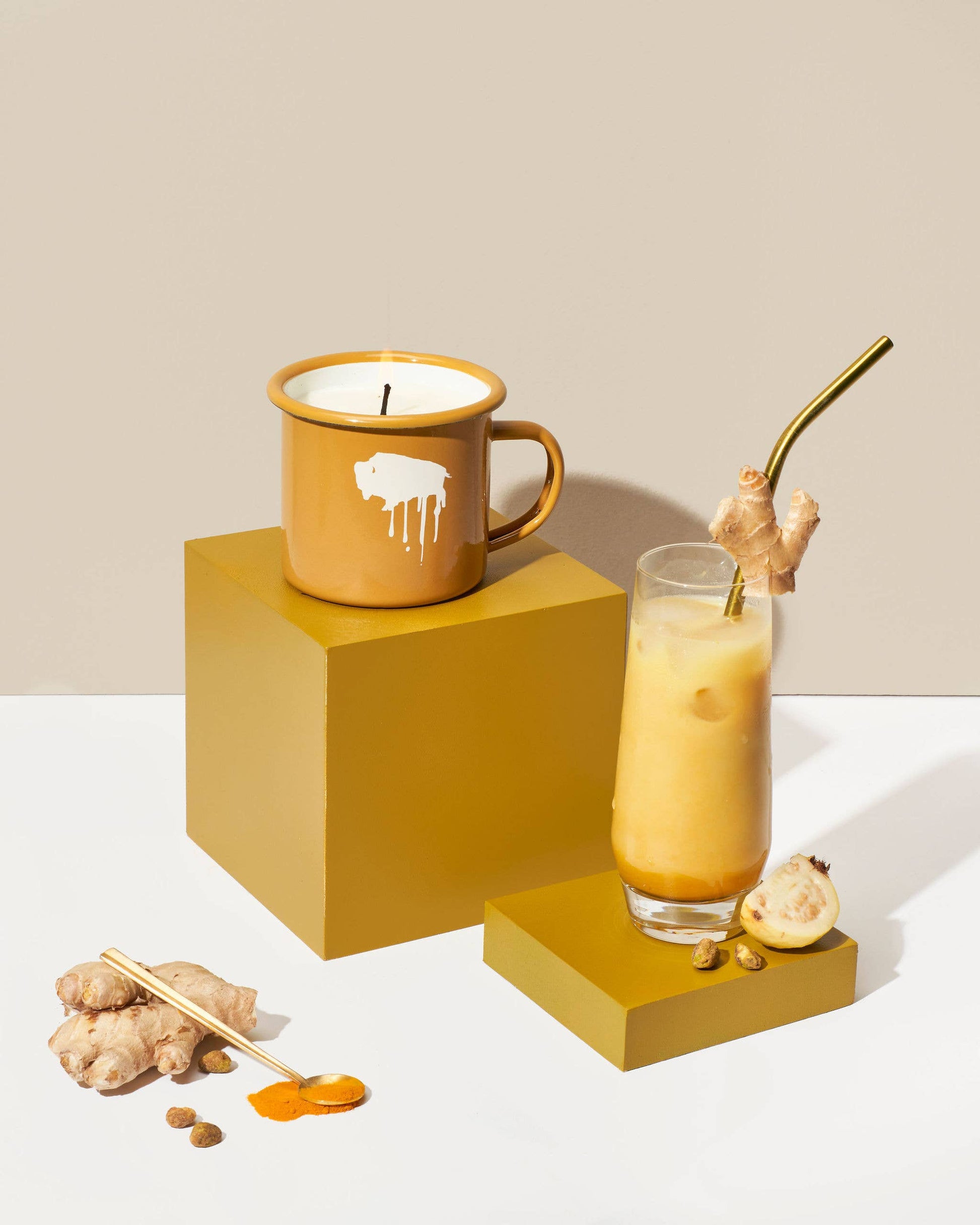 A 12oz custom branded enamel mug filled with a couple of our favorite scents. Perfectly sustainable vessel. Repurpose it for your morning coffee, afternoon tea, or hot chocolate near the light of a campfire. Turmeric Latte: coconut, oat milk, turmeric, ginger, pistachio, guava We believe in clean, small-batch, and hand made. Wax Buffalo candles are poured with the purest American made soy wax, fine phthalate-free fragrance and essential oils, and clean burning cotton wicks. Size: 12oz Burn Time: 55-65 hours
