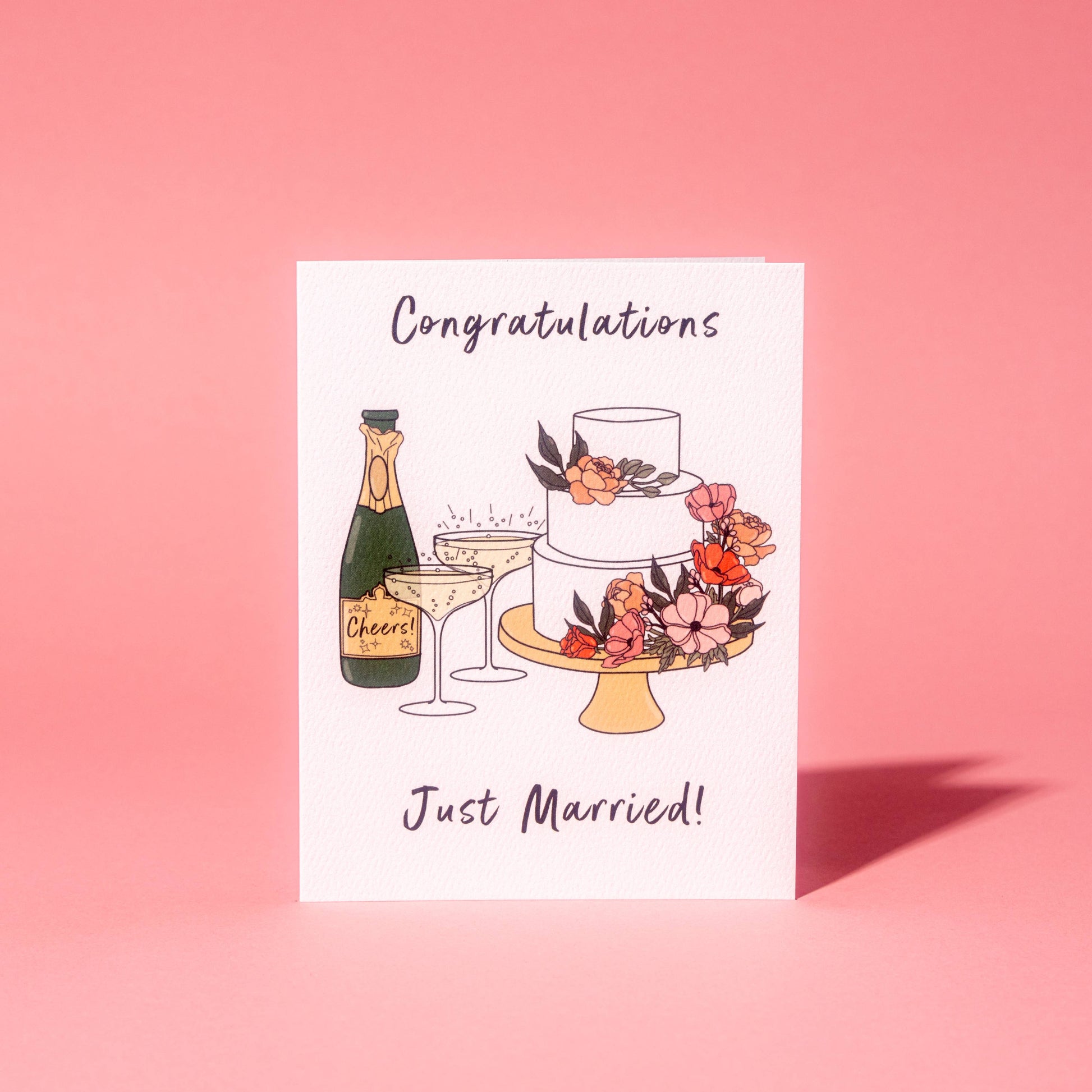 Toast to forever and sweet beginnings! This elegant wedding card, featuring a delightful illustration of champagne, coupe glasses, and a stunning wedding cake, sets the stage for joyous celebrations. Against a pristine white background, the black text proudly declares, 'Congratulations, Just Married!' Here's to a lifetime of love, laughter, and happily ever after. And to make it even more special, this card comes with a dark green envelopes to complete the look.