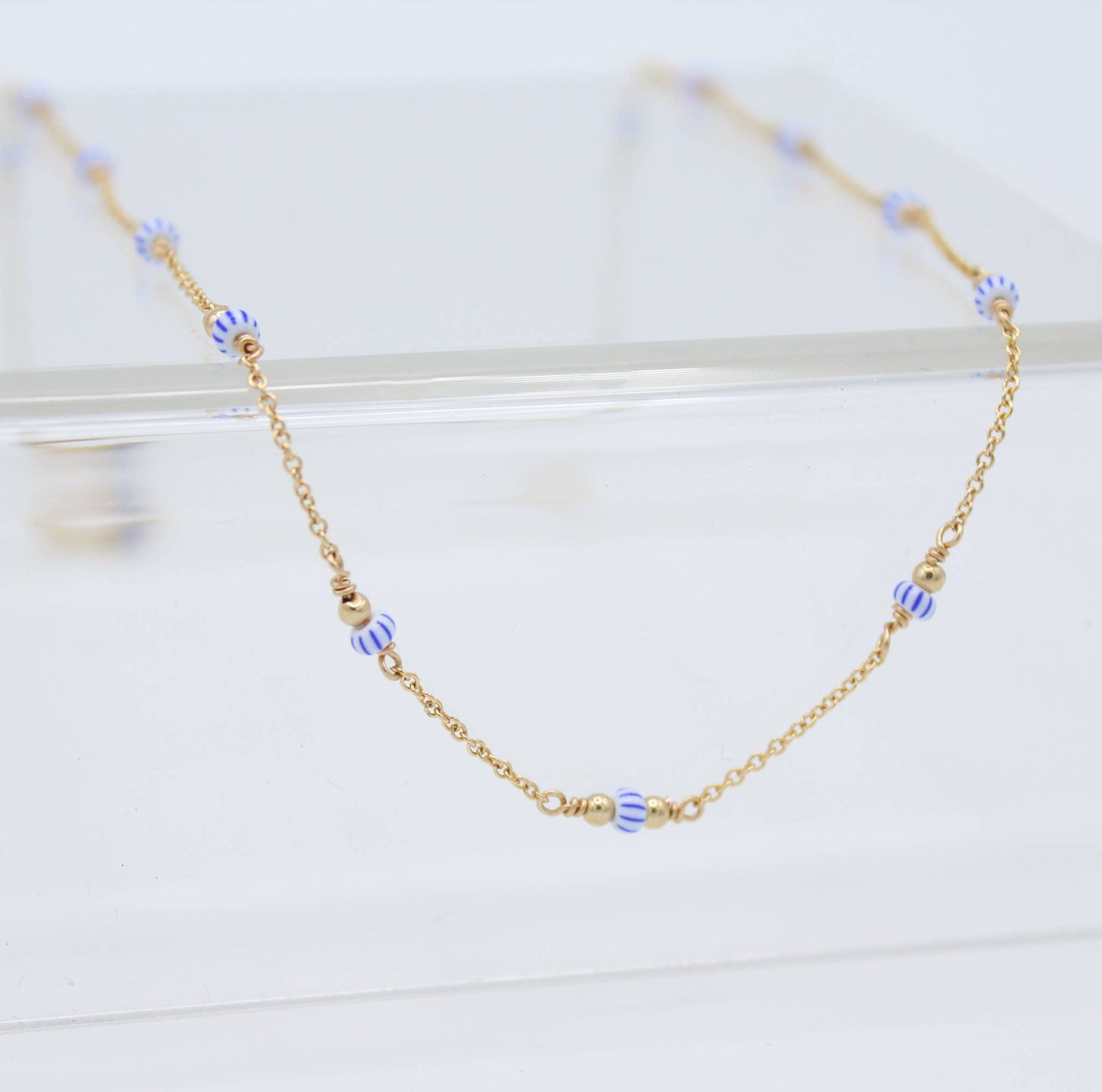 14k gold fill chain, blue and white striped glass beads. 16"