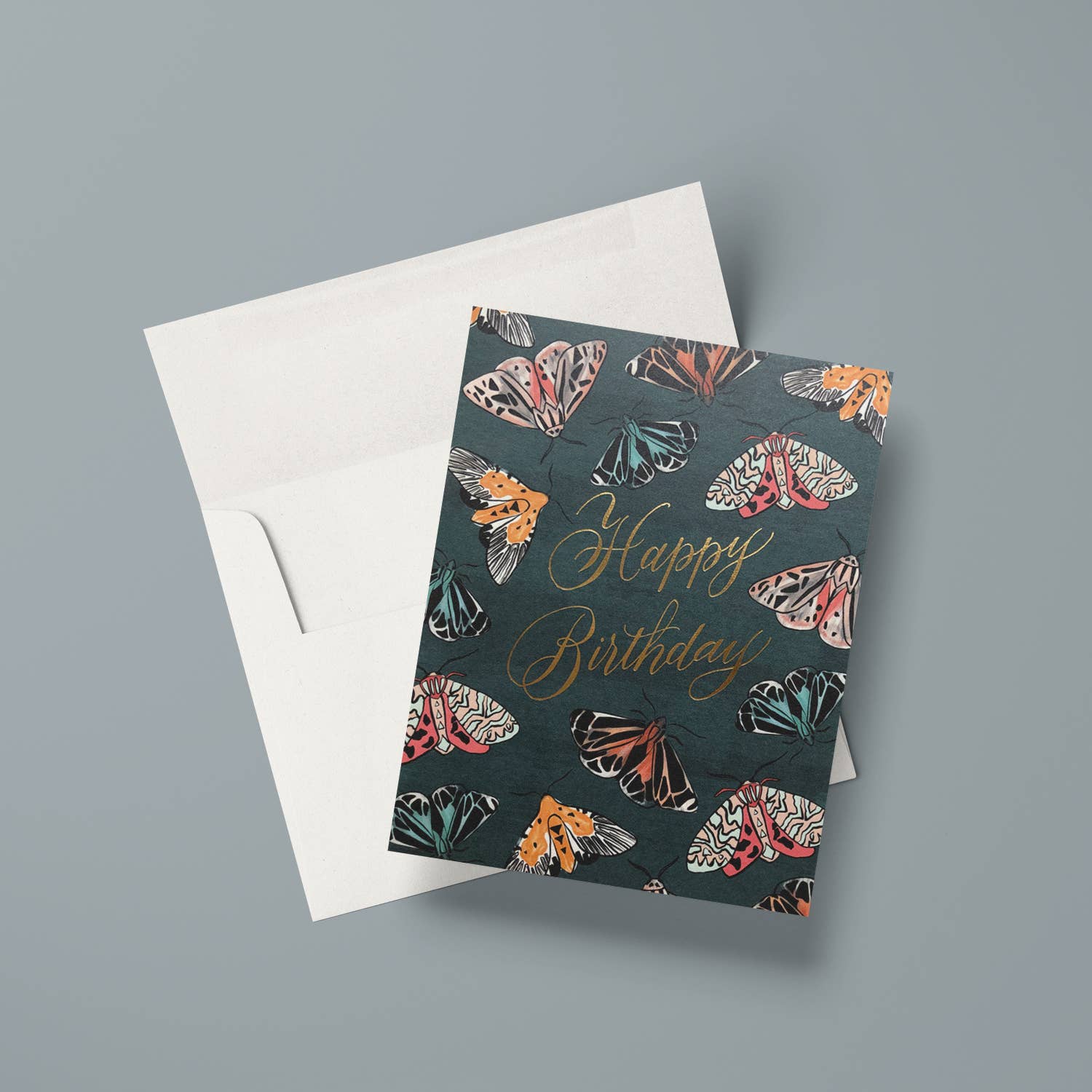 This birthday card featuring beautiful watercolor moths and gold foil hand lettering makes this card perfect for any loved one to enjoy.