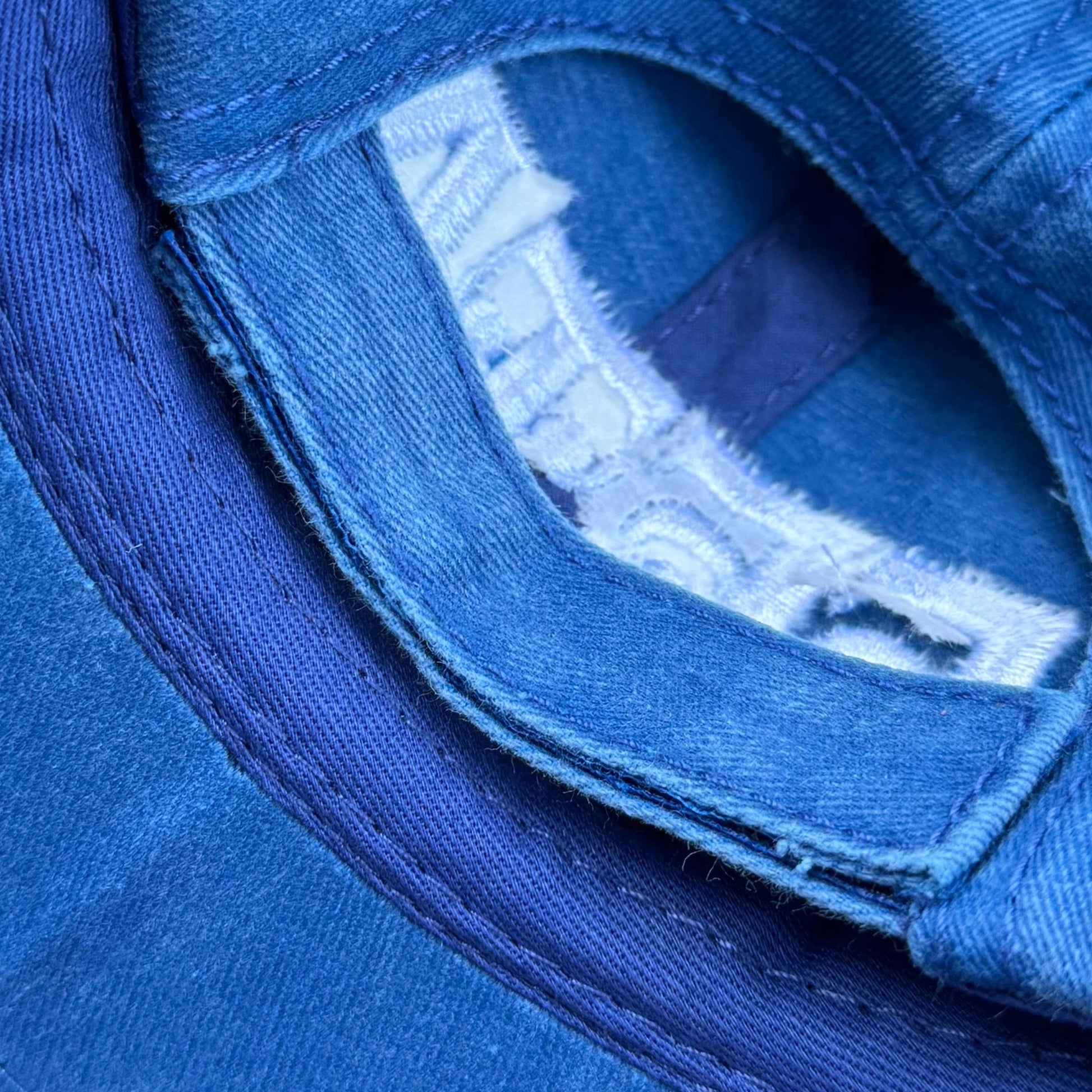 -one size fits most hat in blue with white thread -hook and loop closure at back -embroidered in the US, hat manufactured overseas