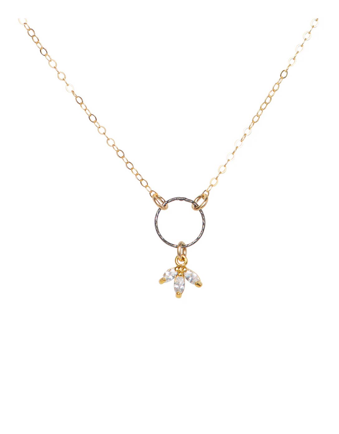Dainty and feminine and easy to layer with your other favorite necklaces, this 18k gold-filled necklace has the perfect amount of sparkle. A pretty little cubic zirconia charm hangs from a gun metal over sterling circle, giving you some awesome mixed metal goodness.