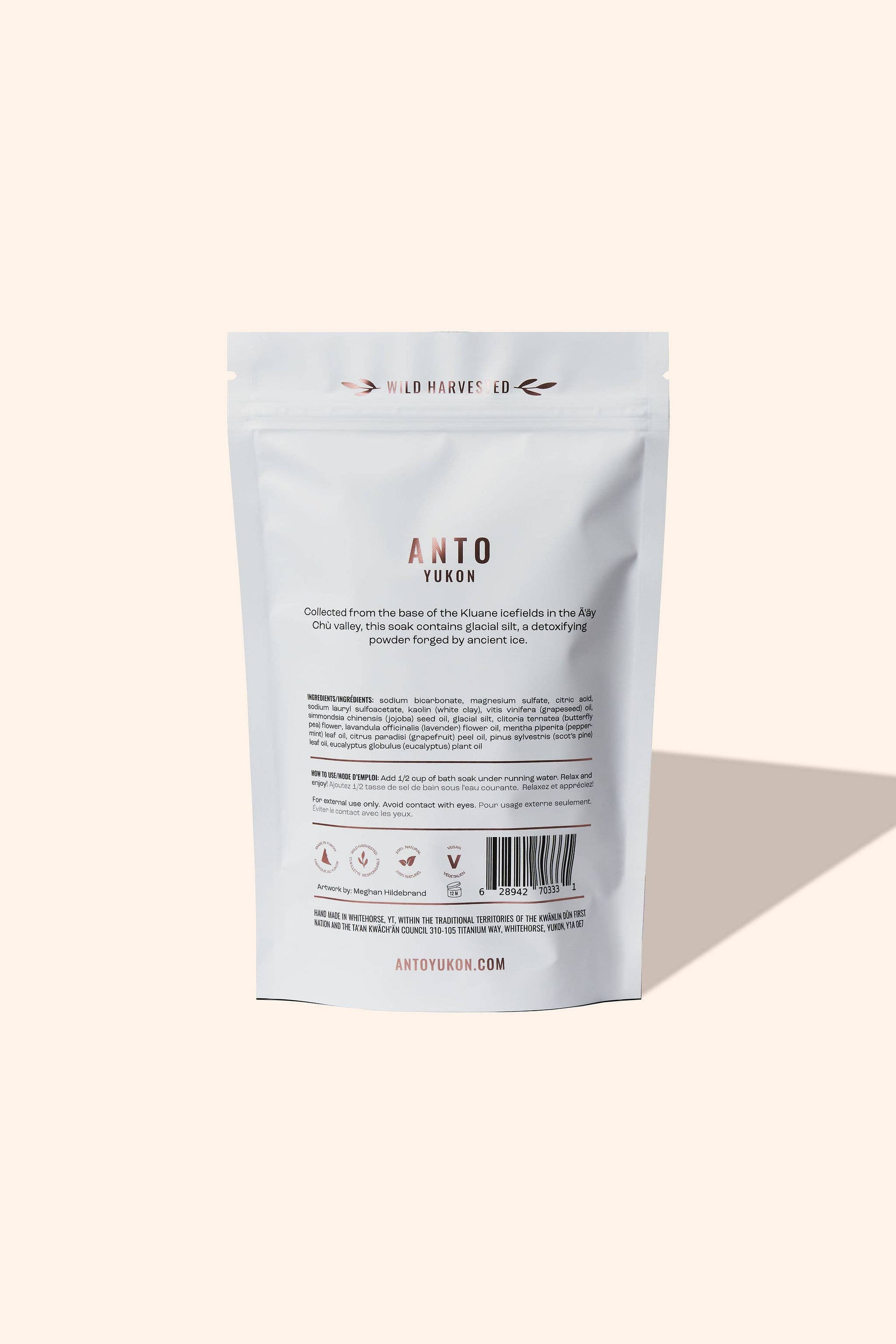 Luxurious foaming bath powder for ultimate relaxation, leaving your skin silky soft. Collected by hand from the base of the Kluane icefields in the Ä'äy Chù valley, this soak contains glacial silt, a detoxifying powder forged by ancient ice.