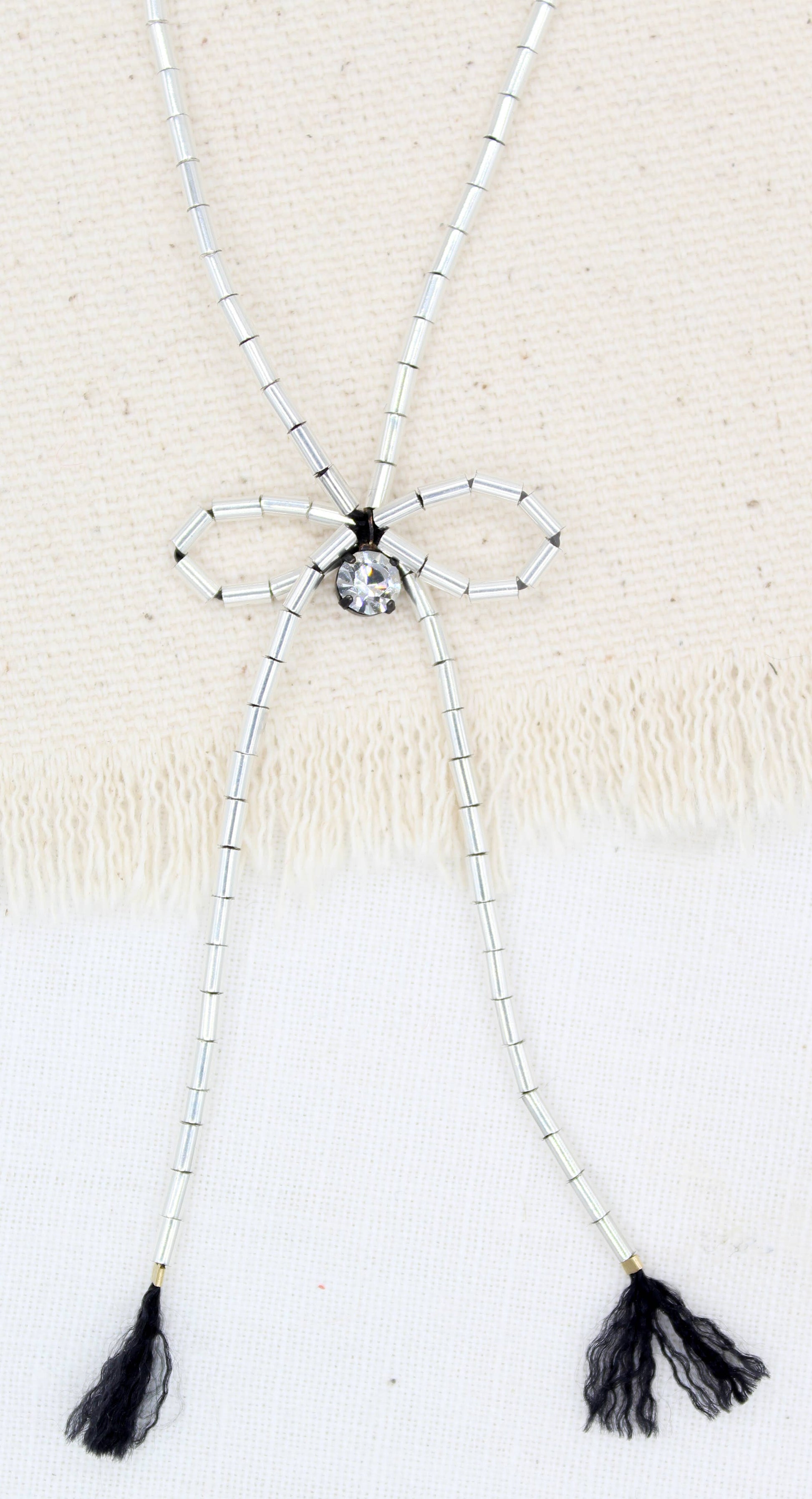 Made from tiny glass seed beads, these playful bow necklaces are so fun for wearing alone or stacking! Strung on silk string and adorned with a sparkly center.