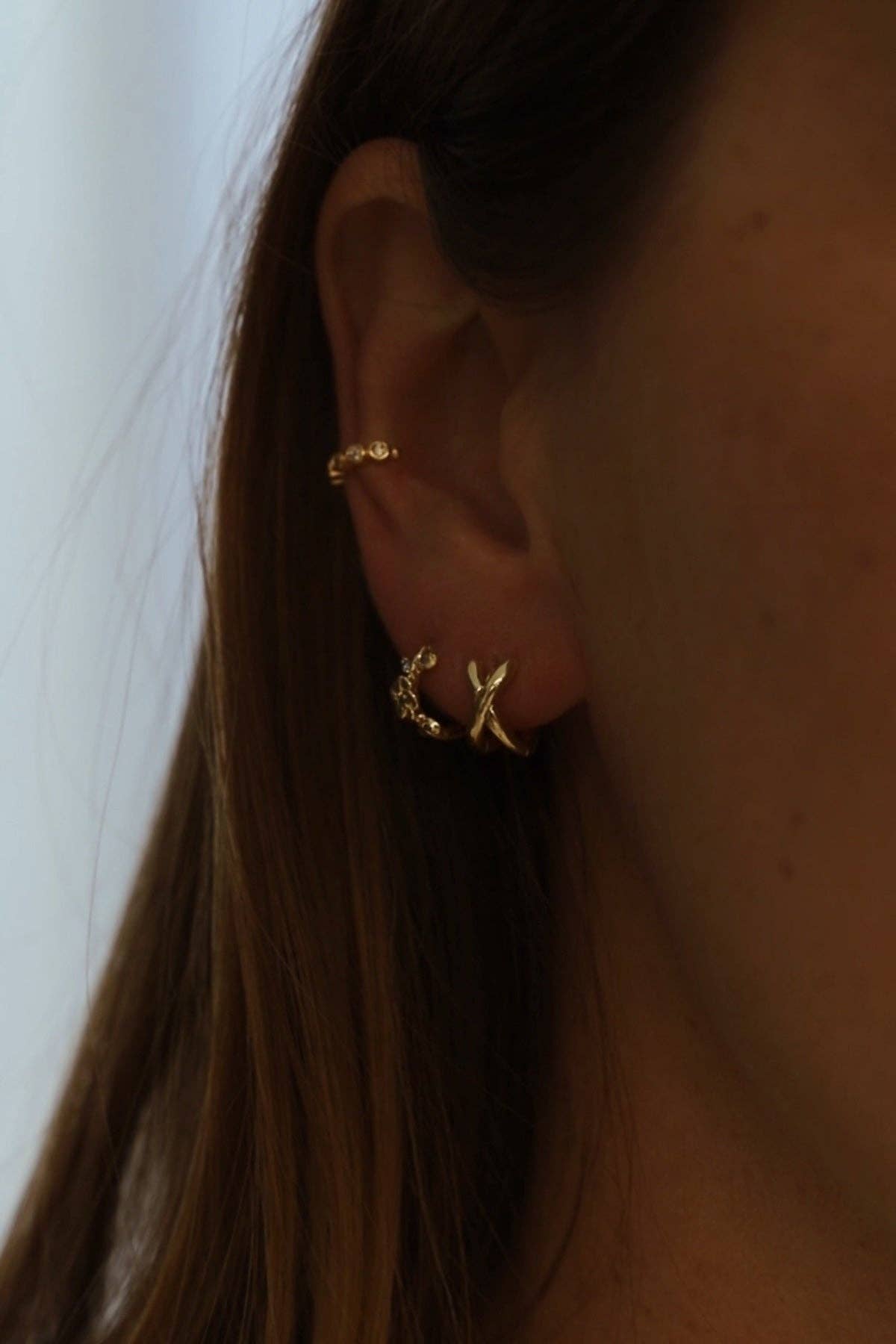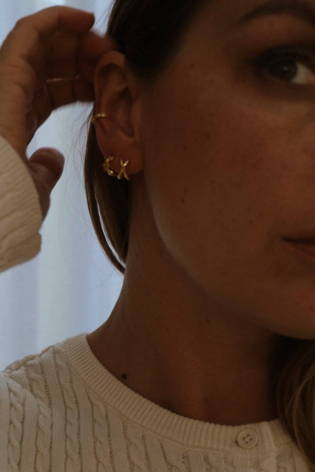Elevate your everyday elegance with these X Cross Huggie Hoop Earrings. Lightweight and comfortable, these hoops hug the ear gracefully, making them an ideal accessory for both day and evening wear. Measurement: 6mm X 9.5mm Material: 14KT Gold Plate over Brass