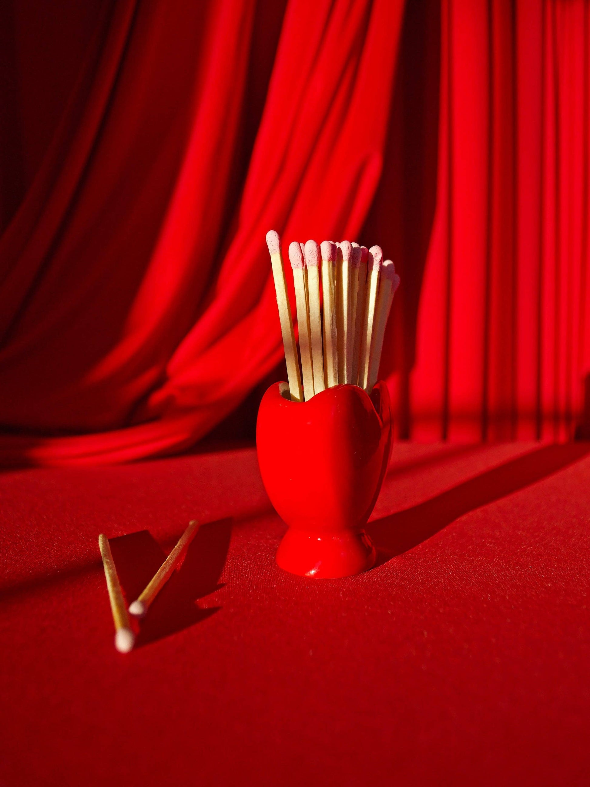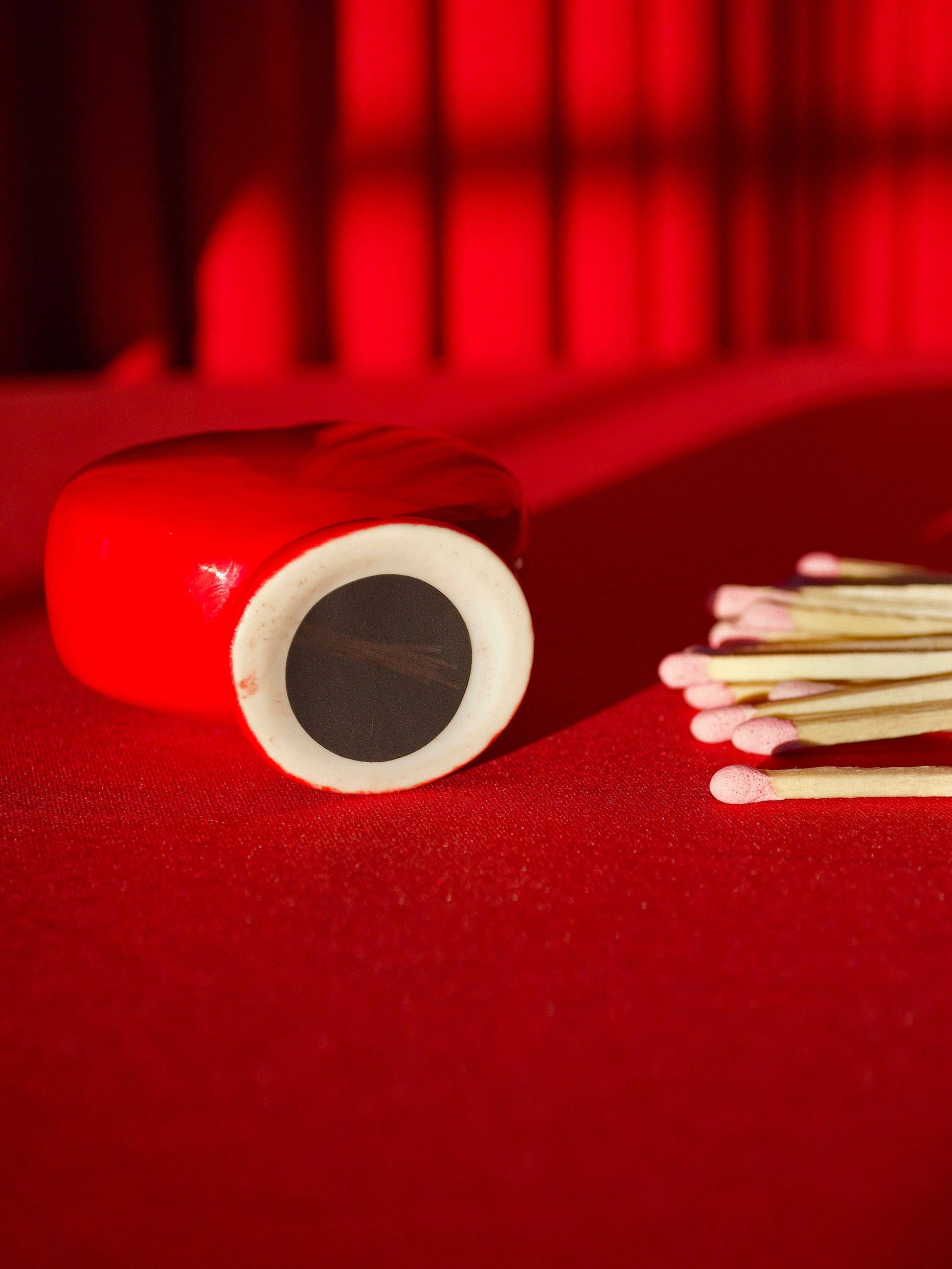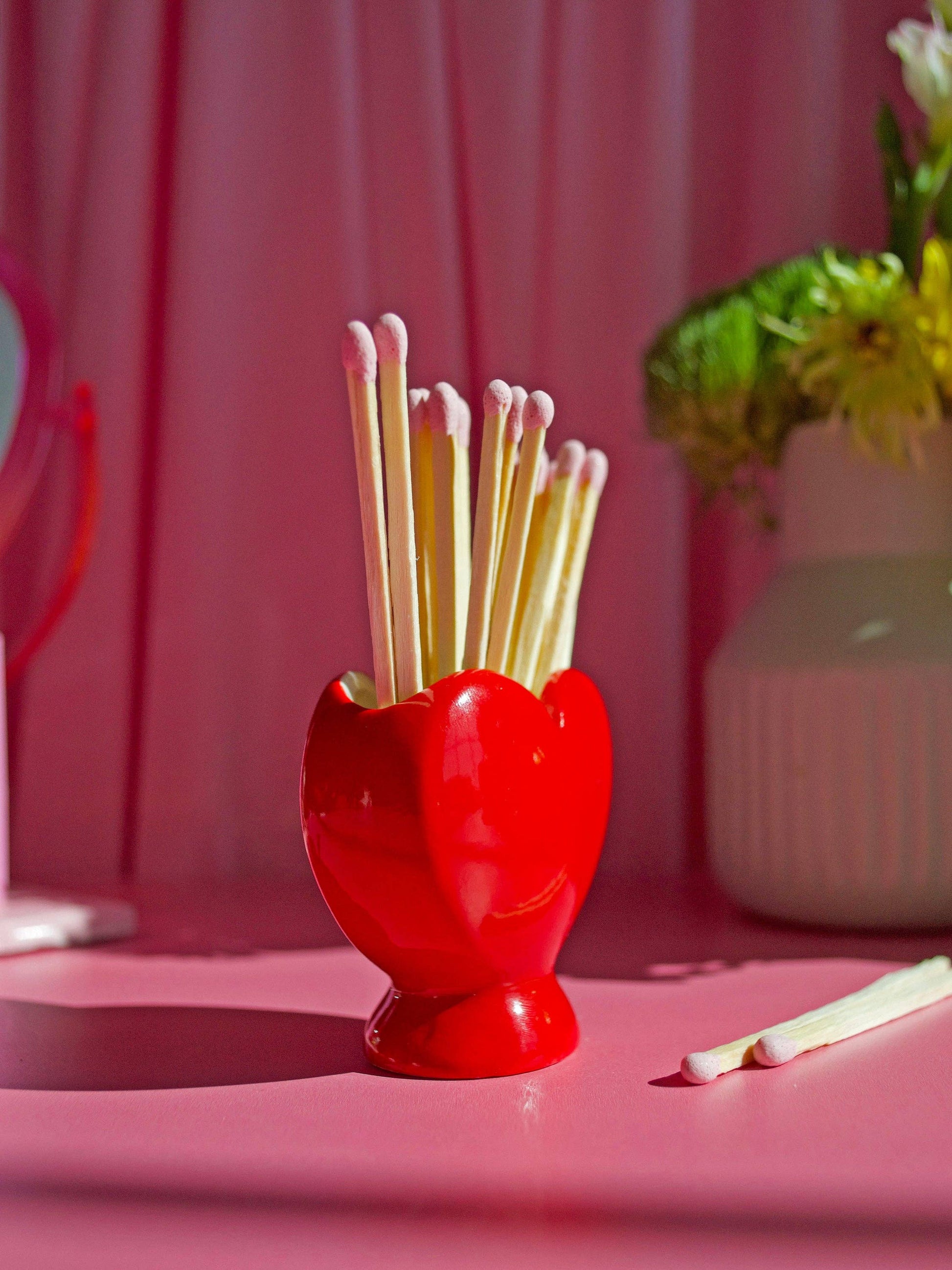 We are a sucker for a heart-shaped anything, and this match striker is no exception! This striker is shaped like the cutest little heart you've ever seen! Comes with 25 matches measuring 3.75" each, stored conveniently inside the heart! When you need a light, tilt it over and strike a match on the base! Looks great on a desk, coffee table, shelf, etc! Also makes a cute tiny vase for tiny flowers :) Heart measures 2.5" x 1.75" x 2.25"