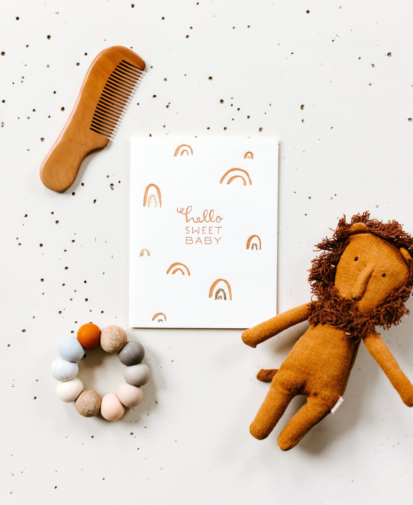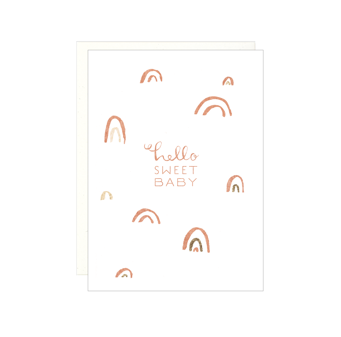 This sweet gender neutral baby card features sketchy hand drawn rainbows in terracotta and gold foil. In the middle of the rainbows reads "hello sweet baby" which is hand written and printed in terracotta ink.
