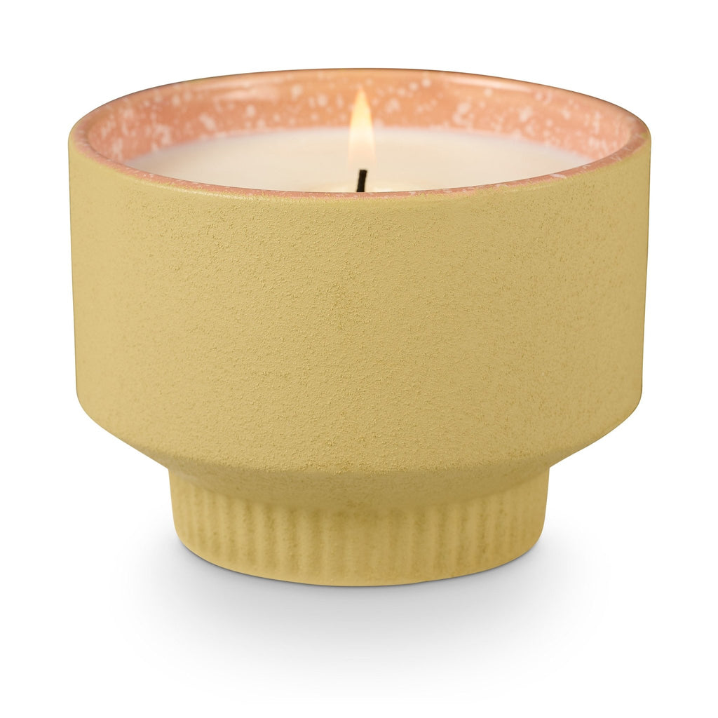 Experience a sunny burst of citrus, a cool touch of frosted sage, and a hint of soft leather. These candles are thoughtfully designed from wax to wick, perfect for every nook and cranny of your home or workspace. On the outside, our angular ceramic dazzles with its solid color, while on the inside unique speckles add a playful touch. With a gentle taper and ribbed foot, this candle will add just the right amount of texture to any room. * Fill Weight: 11.9oz* Product Size: 4.375" x 4.375" x 3.125"* Burn Time: up to 25 hours* Wick Count: 1* Vegan* Cruelty-free* Made with plant-based wax.