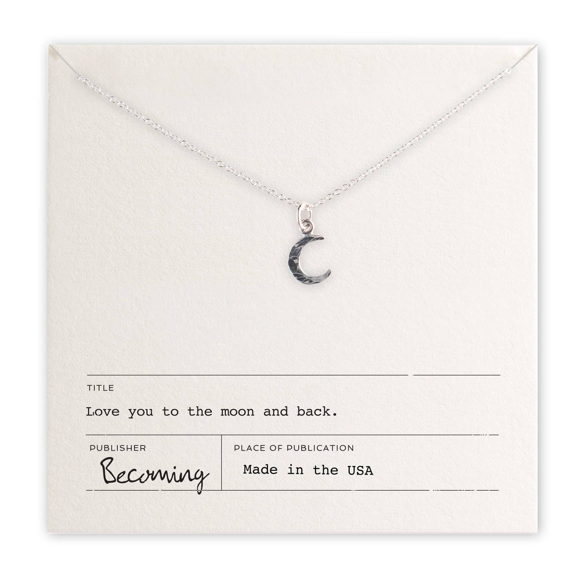 Love you to the moon and back. Charm: Moon Charm size: 3/8" Length: 18" fine cable chain Available metals: Sterling silver. Packaging: Message necklace card + jewelry box