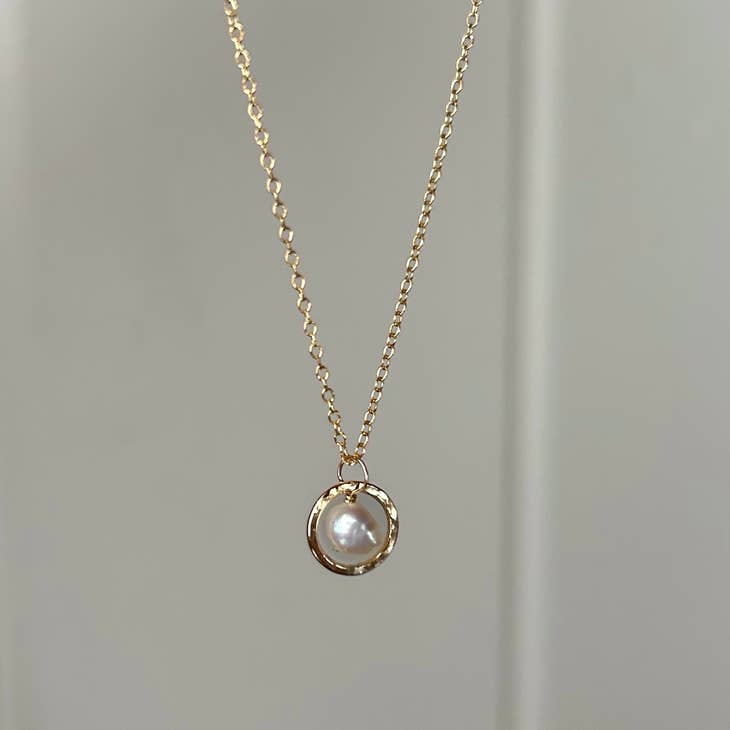 A glittering hammered halo encompasses a tiny freshwater pearl.