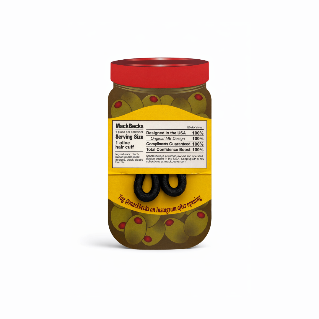 A single olive, perfectly placed — for your hair, not your martini. This sculptural olive hair cuff adds a subtle pop of color and shine to everyday styles. Designed as a small but intentional finishing touch, it’s the kind of detail that elevates a simple ponytail into something considered. Made from high-quality marbled acetate, the Olive Hair Cuff is snack-inspired but thoughtfully constructed. Designed to slide effortlessly onto ponytails, braids, or twists — adding structure and shine without weight. A standalone design object, meant to be worn daily, collected, or kept close as part of your routine.