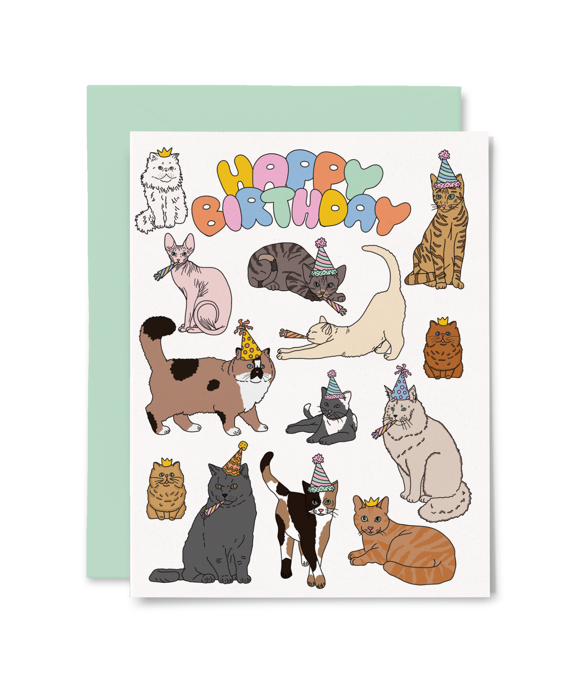 Meow it's time to celebrate! This Happy Birthday card is purrfect for cat lovers features adorable illustrations of cats wearing party hats. The bold and colorful bubble font reads "Happy Birthday" and adds a playful touch to the design. The card comes with a green envelope. • Size: A2 (4.25 x 5.5 inch) • Blank inside so you can write your own personal message • Comes with matching envelope and protective cellophane sleeve • Perfectly imperfect—if you spot a speckle or two, it's all part of the charm of our 100% recycled paper • Made in California