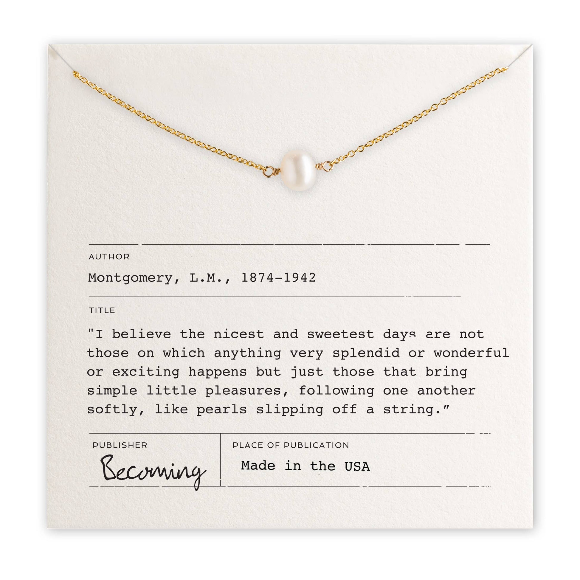 "I believe the nicest and sweetest days are not those on which anything very splendid or wonderful or exciting happens but just those that bring simple little pleasures, following one another softly, like pearls slipping off a string." -L.M Montgomery Charm: Freshwater pearl Charm size: 6mm Length: 16" fine cable chain Metal is sterling silver Packaging: Message necklace card + jewelry box
