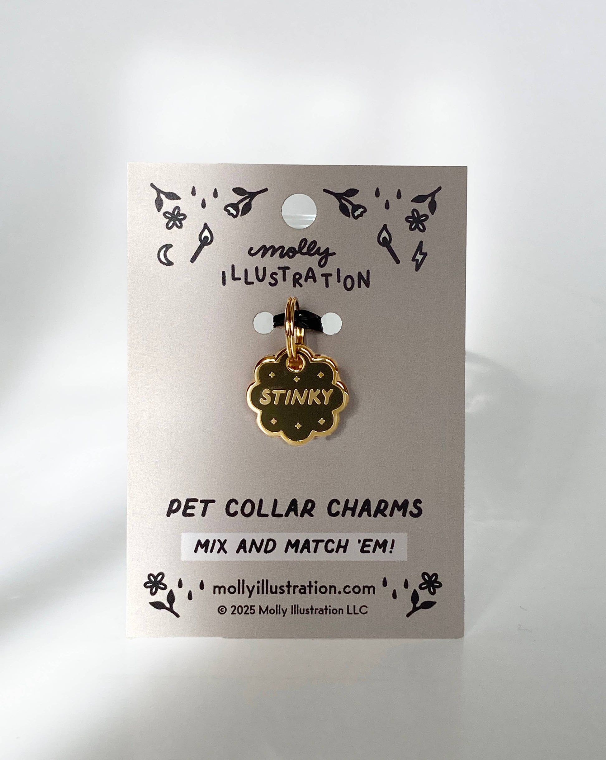 Need a little flair for your furry friend’s collar? Look no further- the cutest little collar charms for your pet. Mix and match the charms to curate a combination that matches your little buddy’s personality. These perfectly petite collar charms are meant to compliment not compete with your pet's ID tag. They are small in size so you can mix and match them without overwhelming their identification tag. -Hard enamel charm -3/4 inch on longest side -Gold color metal plating -Split ring to easily secure to collar -Molly Illustration logo on back -Shipped with a backing card If the charm shows signs of damage remove from pet immediately. These items are not intended for children- small parts are a choking hazard.