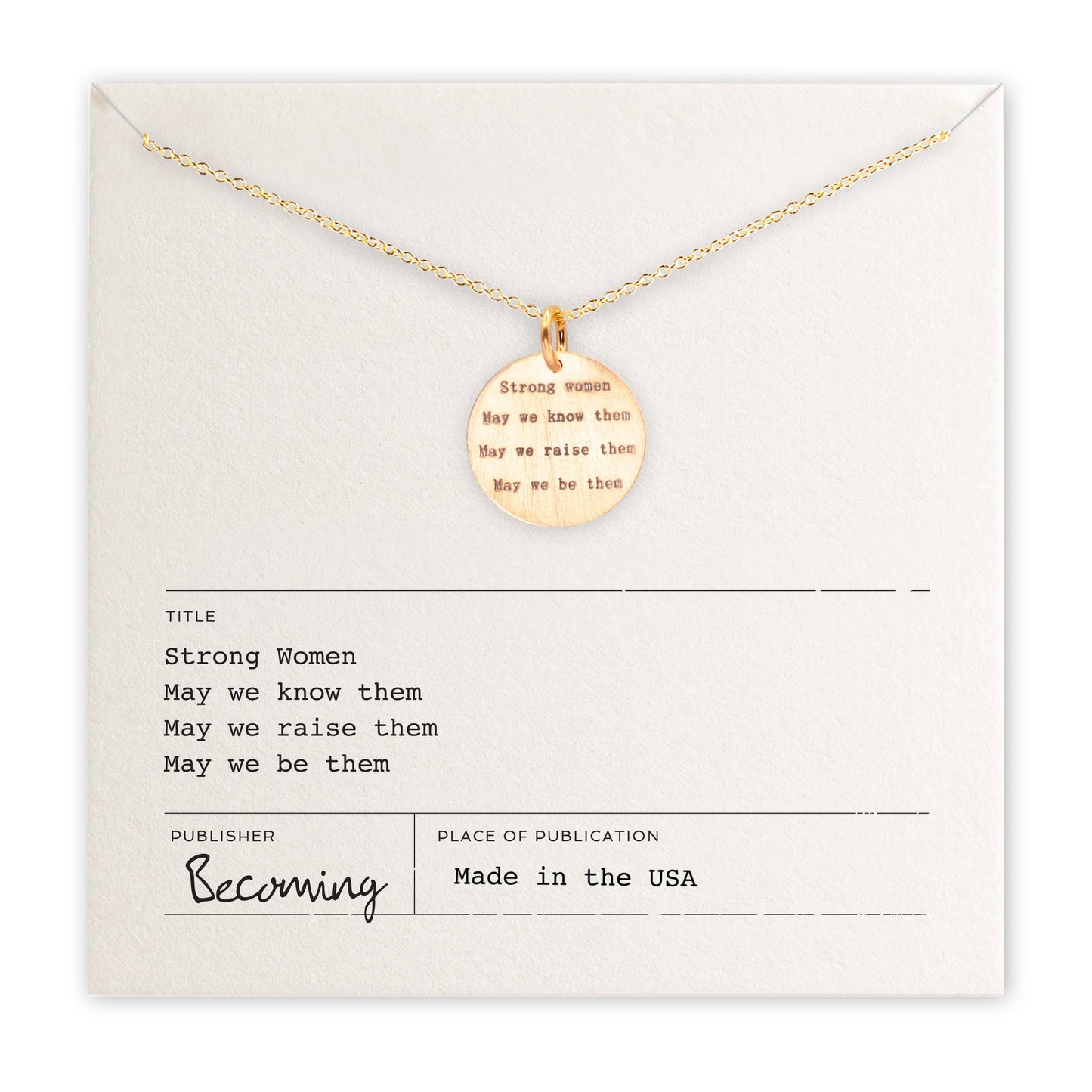 "Strong women May we know them May we raise them May we be them." written on the charm. Crafted with gold fill, this charm necklace boasts a 5/8" charm on a 18" fine cable chain.