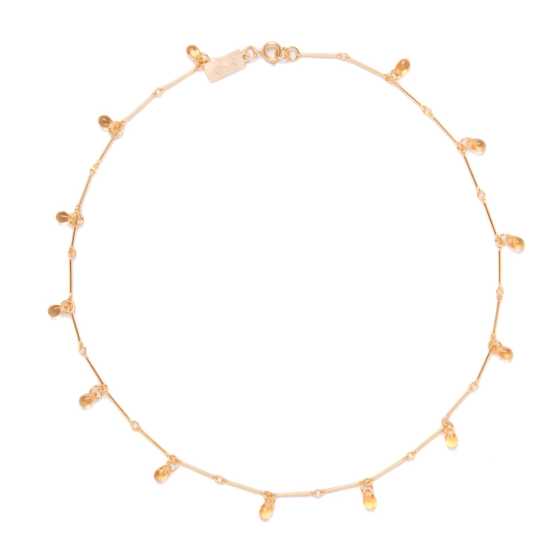 Delicate topaz glass teardrops cascade from a graceful fringe necklace, catching light with every movement. This playful piece brings a touch of sparkle and sophistication to any outfit, whether you're dressing up for a special occasion or adding a little glamour to your everyday look. The warm, golden hues of topaz glass complement a variety of skin tones and styles, making it a versatile favorite you'll reach for again and again.