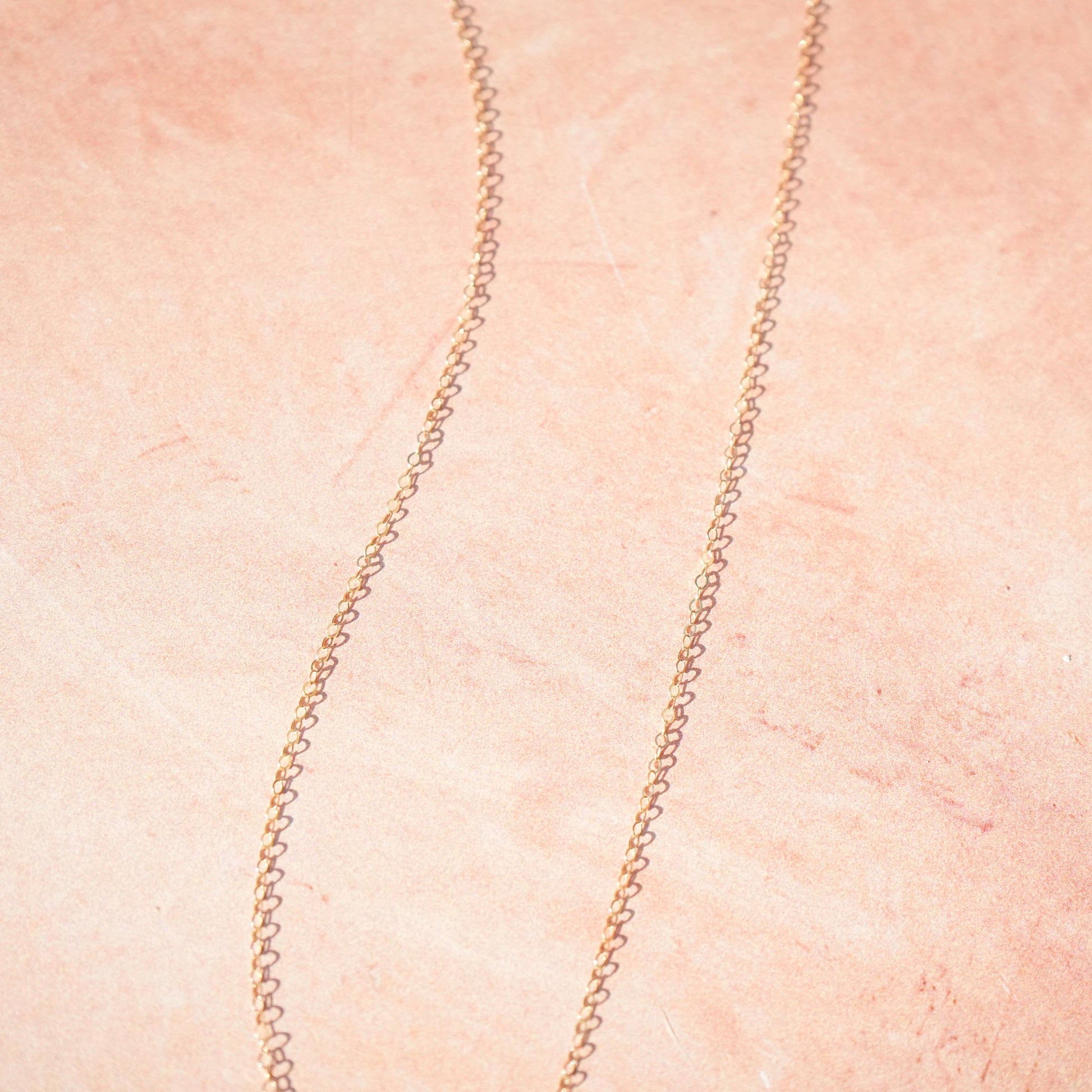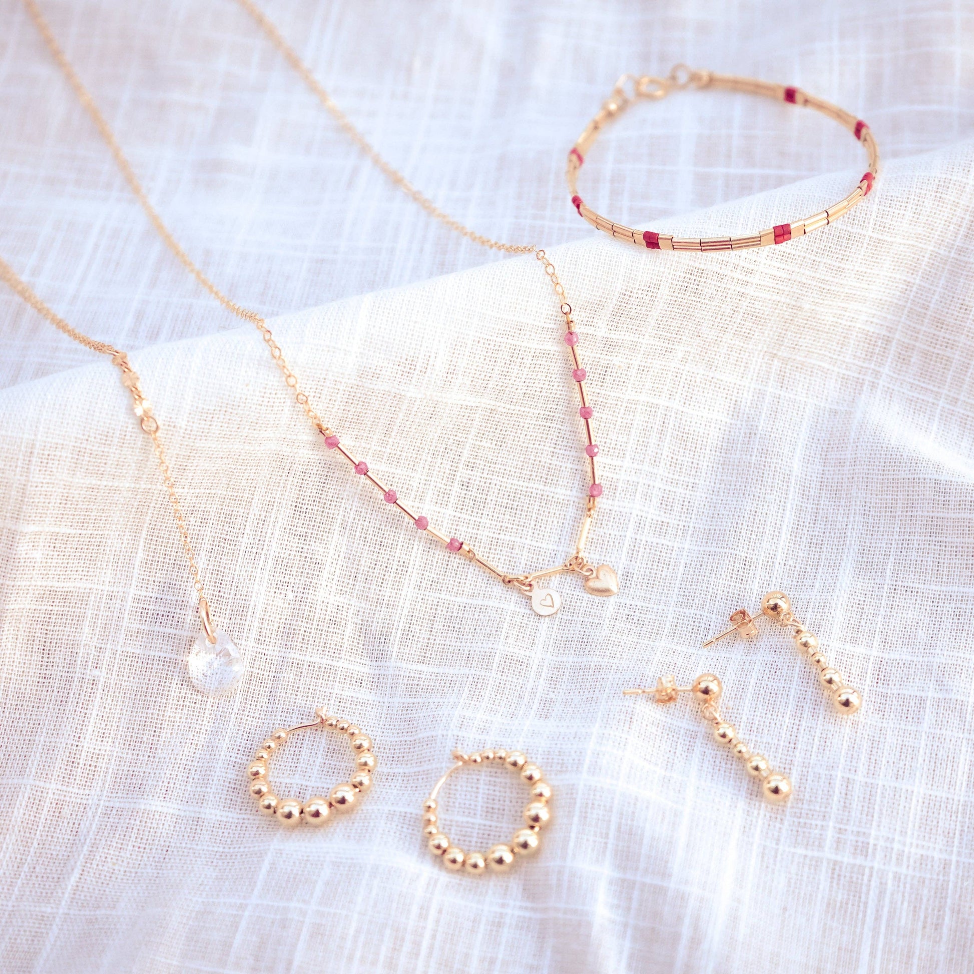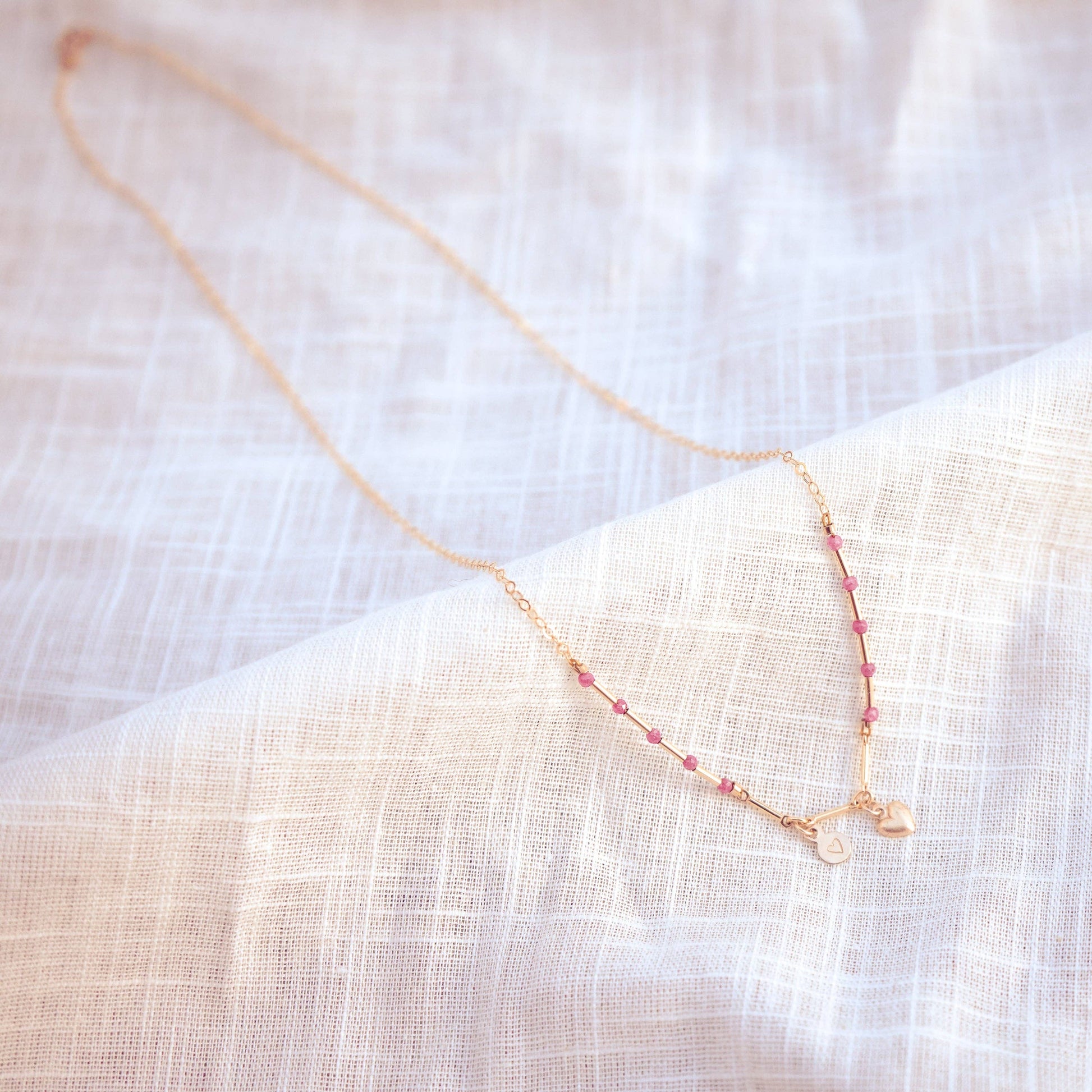 Love is the beautiful connection of two unique hearts, beating as one along one lifeline. A hand-stamped heart charm is gracefully paired with a delicate heart charm, adorned with tiny, faceted rubies, on a dainty gold chain.