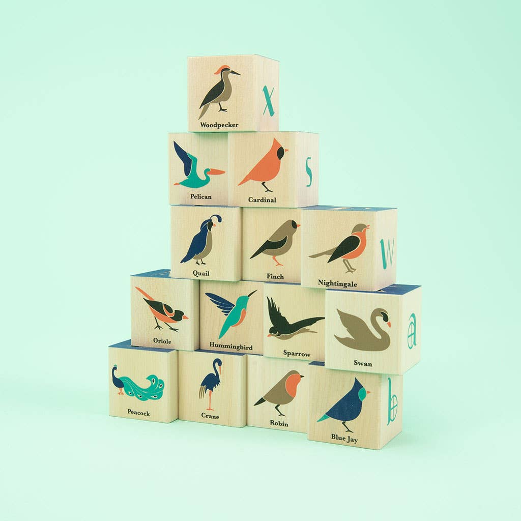 One side of each block reveals a close up of the bird featured on its opposite. Colorful Art Nouveau letters grace the remaining sides. Two debossed letters on each block. A companion to our Bug, Flower, and Ocean sets.