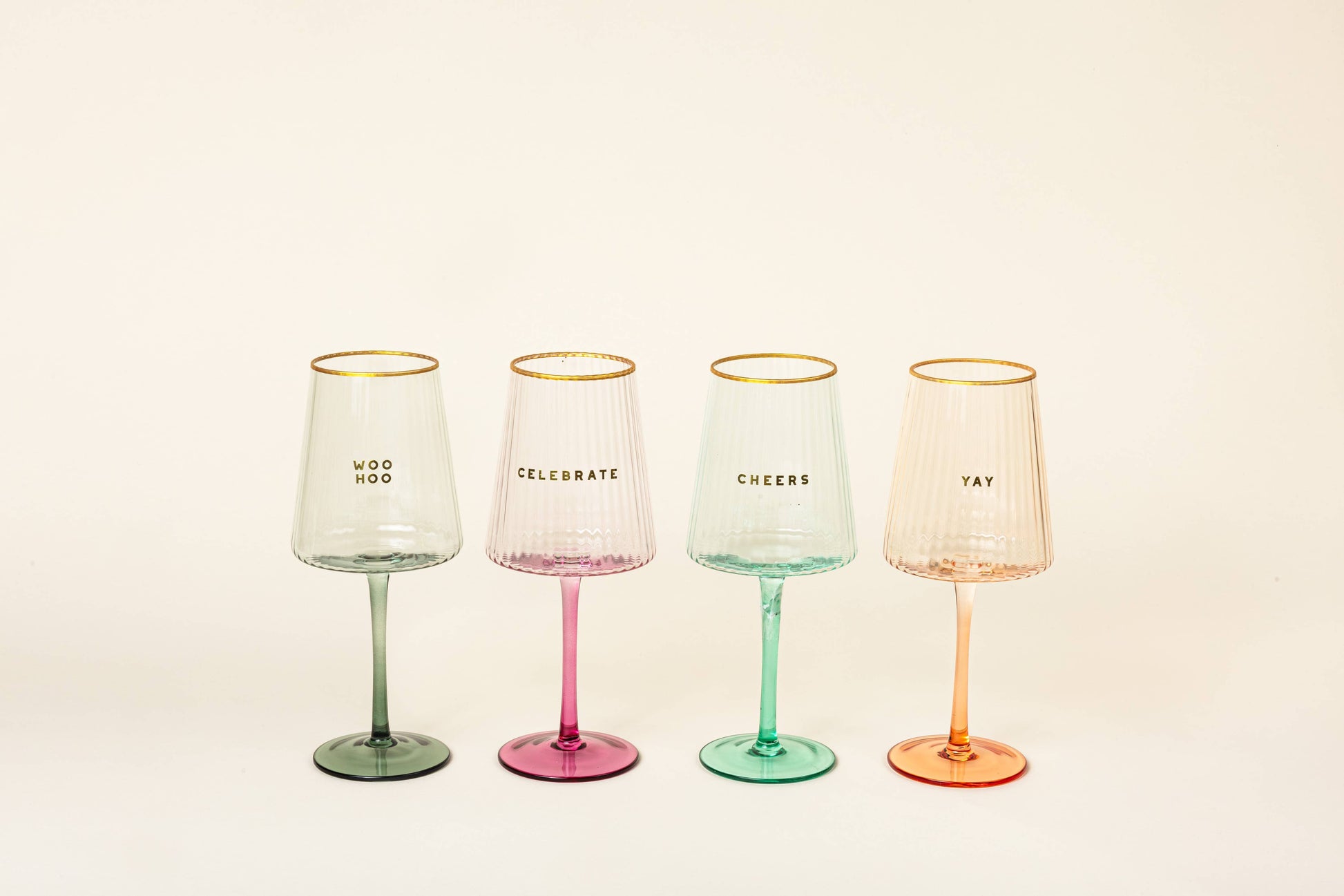 Cheers to all of life's best moments with our 16oz ribbed wine glass. This glass is made of emerald green ombre lead-free crystal glass, and features a gold rim. Reads WOO HOO in small gold foil print. Hand wash only.