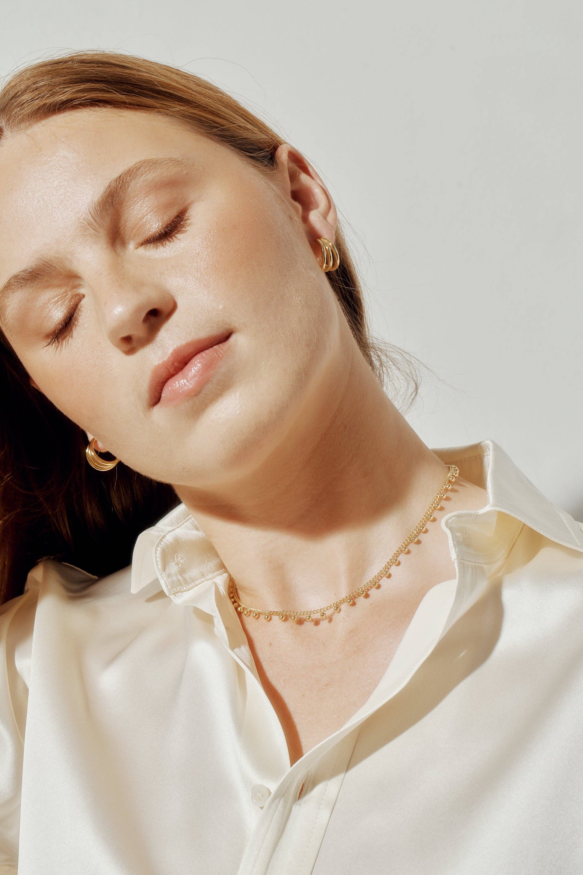 Effortlessly elegant. The Zuri Dainty Beaded Necklace features a fine gold-filled chain adorned with polished mini drop beads for a look that shimmers with every move. Lightweight and hypoallergenic, it’s made for layering — or wearing solo for a clean, refined finish.
